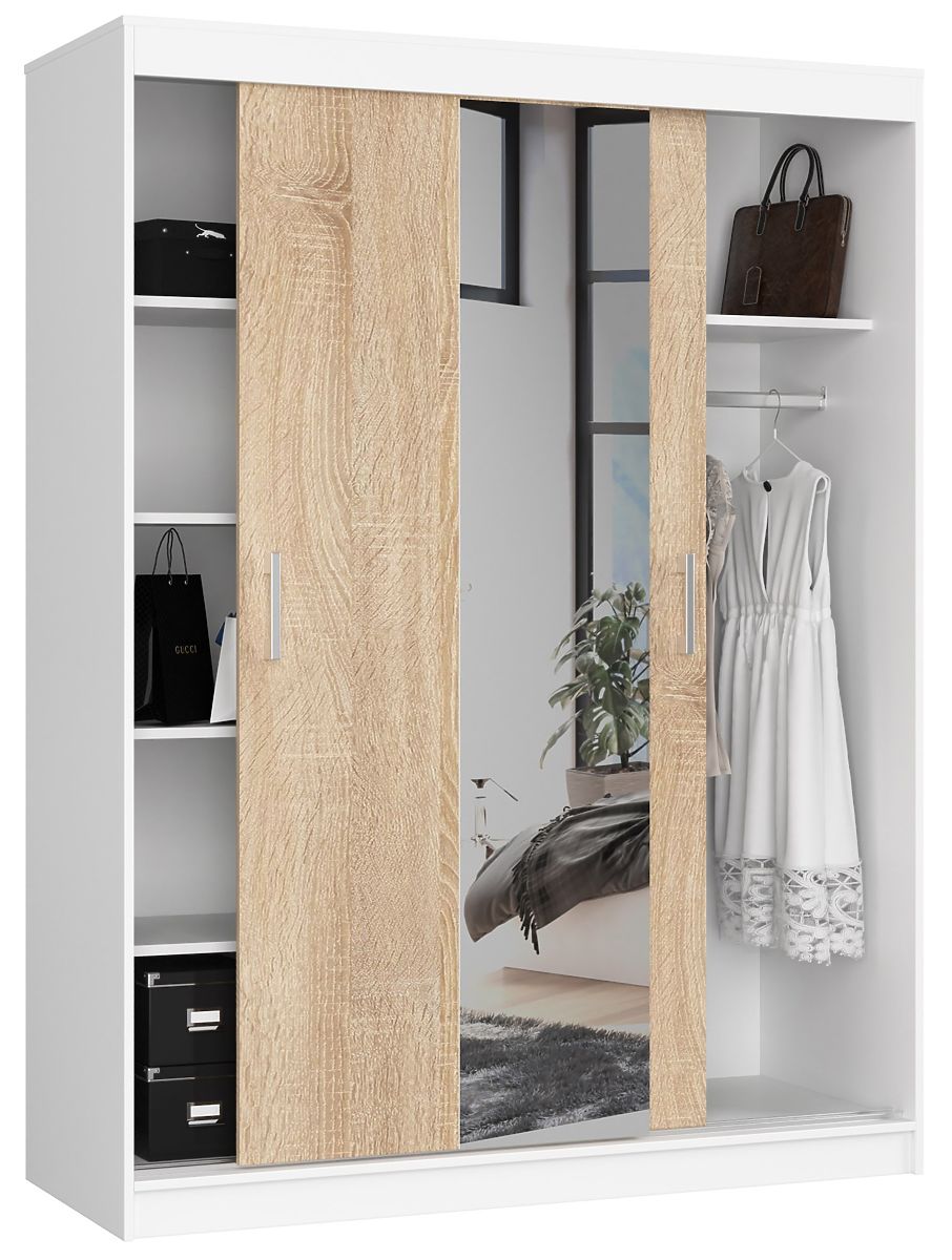 Fehér tolószekrény sonoma tölgy dekorral, 150 cm hosszú, polcokkal és ruharúddal. Nagy felület kihasználásra.