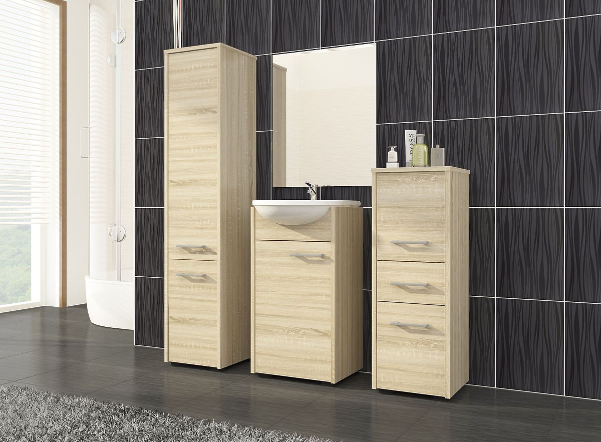 MAGAS FÜRDŐSZOBAI SZEKRÉNY FIN 2 AJTÓ SONOMA 16 mm vastag, kopásálló laminált lapból készült.