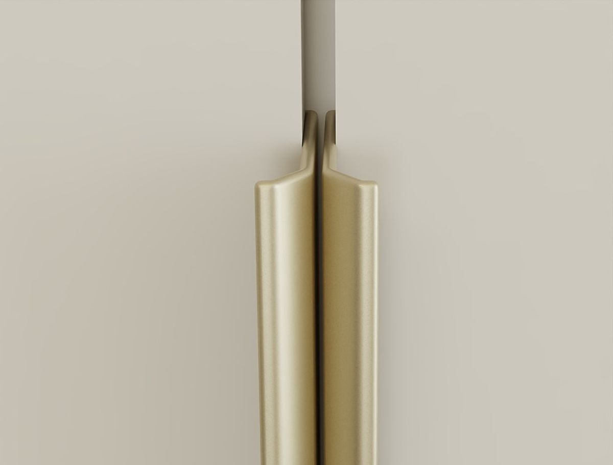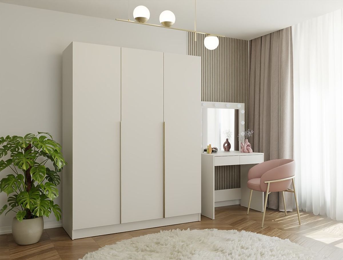 Ha a minimalizmus, az elegancia és a kivételes funkcionalitás kombinációját keresi, a SENSO 3D szekrény éppen Önnek való. Ez a háromajtós szekrény egyszerű formájával, kasmír színű matt felületével és jellegzetes, kefe arany árnyalatú arany fogantyúival tűnik ki, amelyek kiemelik luxus jellegét.