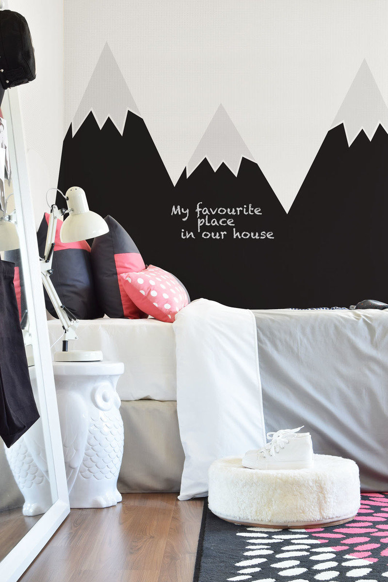 Fantáziadús dekoráció, mely remek például gyermeke ágya mögé. A fal az ágy mögött ugyanis soha nem lesz piszkos. Nagy előnye ennek a dekorációnak az, hogy a fekete a felületre klasszikus fehér krétával lehet rajzoln vagy írni és így gyermeke fejlesztheti fantáziáját.