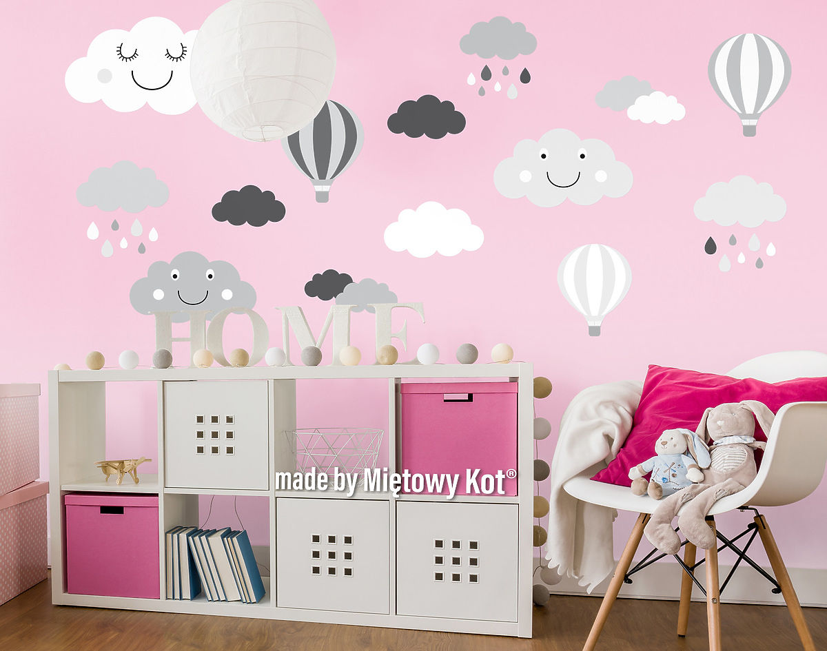 Elegáns faldekoráció szép felhők és repülő léggömbök formájában elegáns szürke színben. Tökéletes kiegészítő minden gyerekszobába.