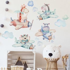 Gyönyörű matrica motívummal állatpilóták repülőgépeken. Zsiráf, zebra, víziló és réz repül repülővel a felhők között. A matricát élénk pasztellszínek díszítik. Élvezze gyermeke szobáját egy aranyos faldekorációval. A falon lévő alkatrészek elrendezése a kezedben van. Ha élvezni szeretné a szórakozást, vonja be gyermekeit a díszítésbe.