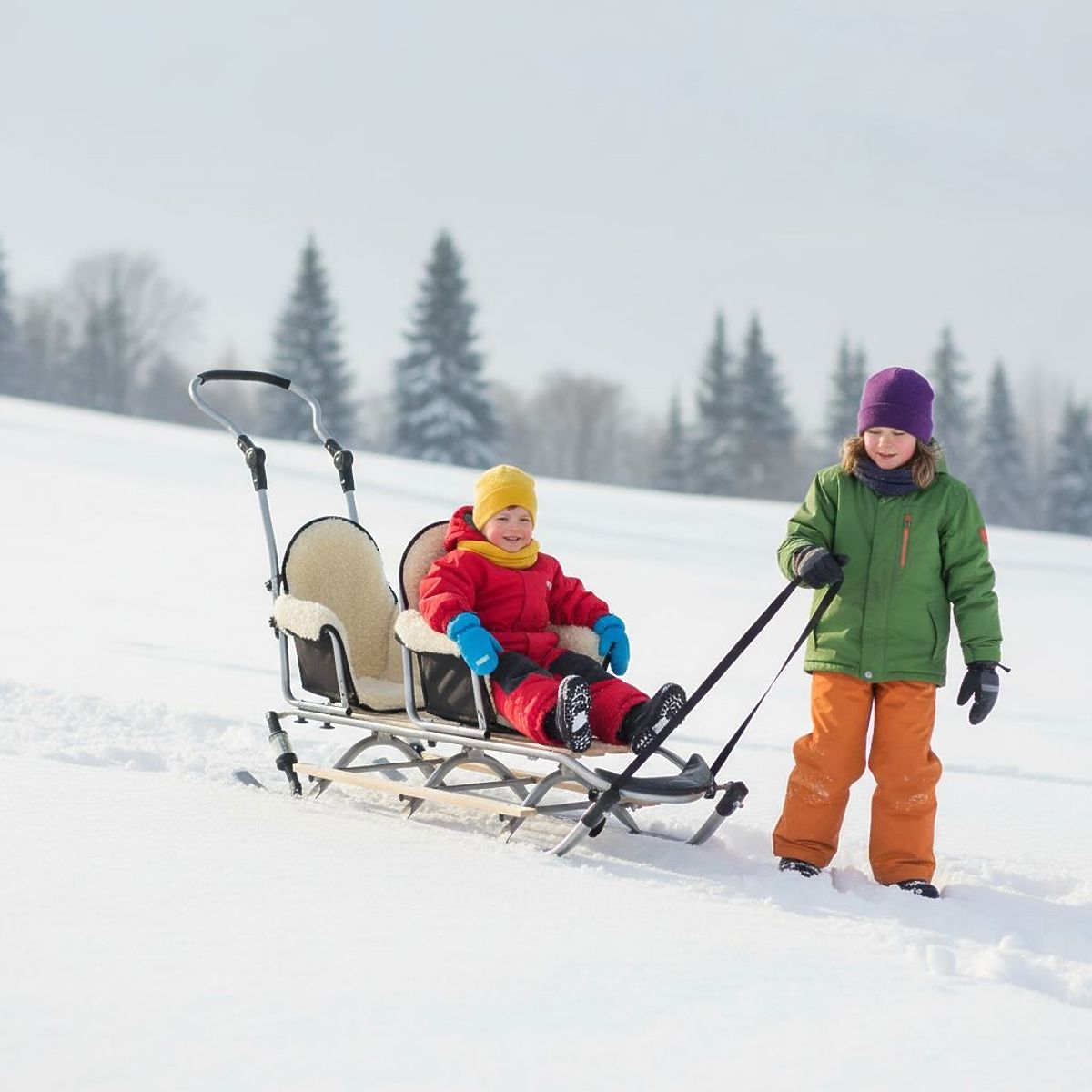 A szán háttámlával, fogantyúval és meleg gyapjúbetéttel rendelkezik, amely kényelmes a gyermekek számára.