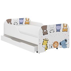 Oldalsó leesésgátlóval ellátott Miki gyerekágy állatkerti állatkák mintával 160 x 80 cm méretben. Az ágy tartozéka két oldalsó leesésgátló és egy ágyrács.