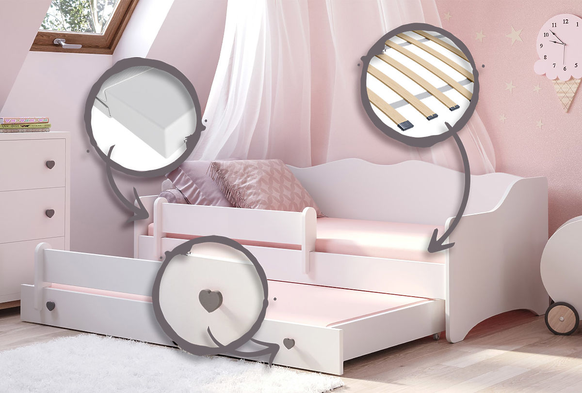 Az Emma ágy kiemelkedik funkcionalitásával, amit a gyerekek és szüleik egyaránt értékelni fognak. A tanúsított bútorlapból készült masszív szerkezetének köszönhetően az ágy akár 110 kg terhelést is elbír, ami hosszú távú használatot biztosít. A gyermek biztonságát lekerekített élek és levehető védőkorlátok garantálják, amelyek könnyen igazíthatók a gyermek igényeihez. A FLEX rács rugalmas léceivel kényelmes és komfortos alvást biztosít. Ezenkívül az alsó ágy, bár nem tárolásra szolgál, kényelmes és biztonságos alvóhelyet nyújthat a második gyermek számára, ami helyet takarít meg a szobában.