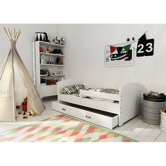 A 160 x 80 cm-es lekerekített ágytámlával ellátott fehér MIKI ágy a legnagyobb gondossággal készült, és univerzális megjelenésének köszönhetően mind a lányok, mind a fiúk szobáját kényelmessé teszi.