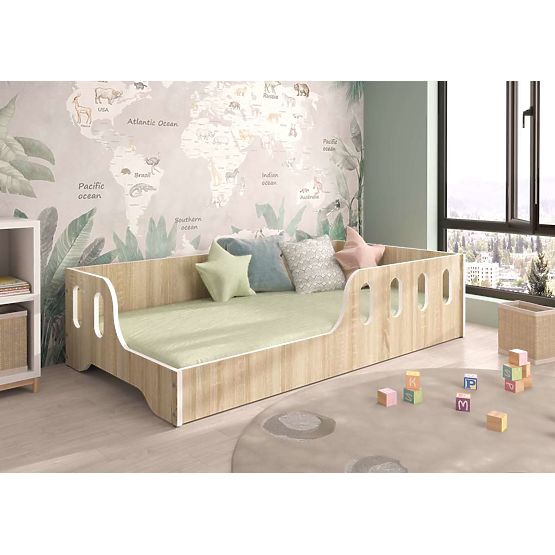 A Sonoma tölgy dekorációjú Koko Montessori gyermekágy kifejezetten alacsony magassága miatt ideális olyan kisgyermekek számára, akik megtanulnak bemászni és .. többet
