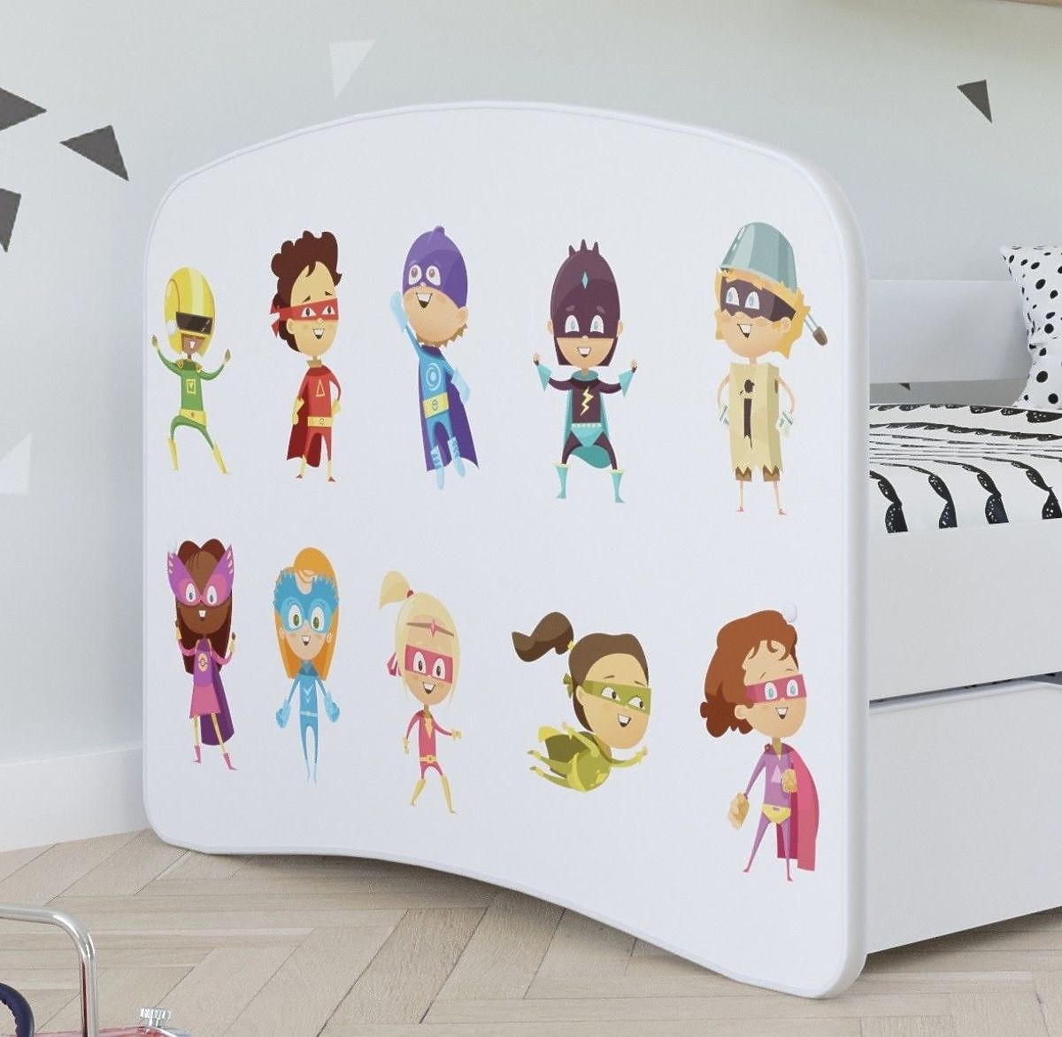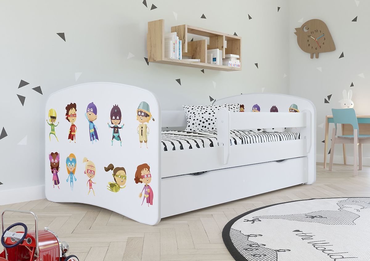 Babaágy tíz kis szuperhős képpel, fehér alapon. Minden hősnek van egy eredeti szuper ruha. Csak a gyermek képzeletétől függ, hogy a szuperhatalmak mindegyiket feltalálják. Az ágy gyermekek számára alkalmas fiúk és lányok számára.