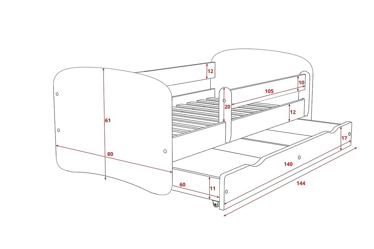A gyerekágy maximális biztonságot nyújt a lekerekített éleknek köszönhetően, így a gyermekek nem sérülhetnek meg. A 100 cm-es levehető védőkeret megvédi a gyermeket az ágyból történő kellemetlen leeséstől.