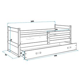 Egyetlen sziklás ágy természetes és szürke színek kombinációjával a gyerekszobában fiókkal és biztonsági rúddal. Signallemzők: - a korlát univerzális, az .. többet