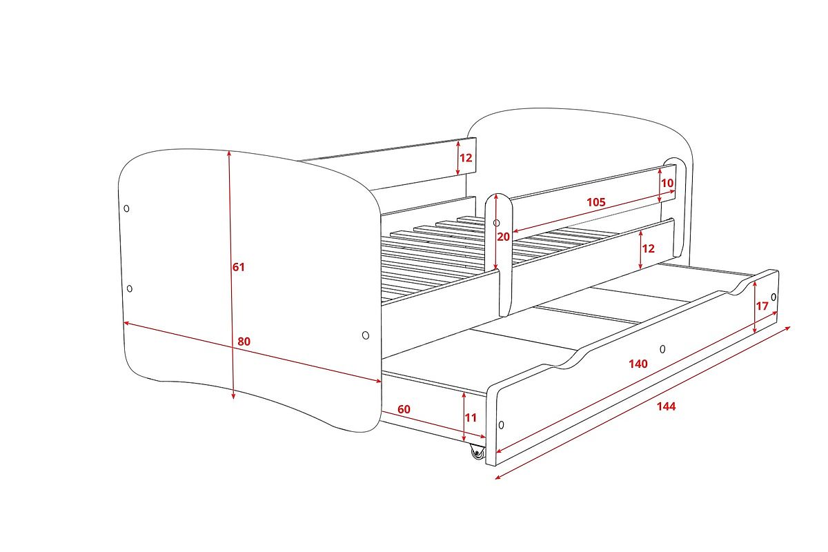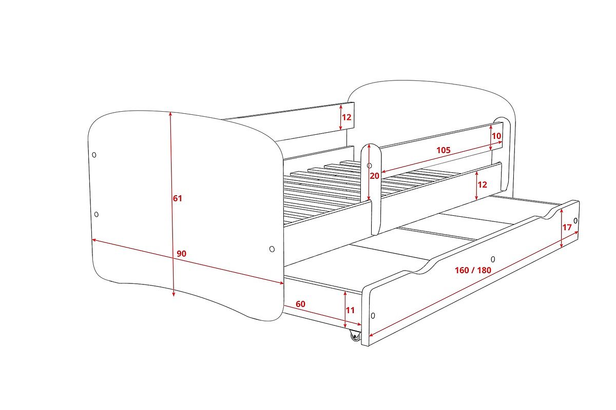 Az ágyat jellemzi a funkcionalitás, a kényelem, a gyermekeknek szóló dizájn és az egyszerű szerelés. Az ágy laminált faforgácslapból, a ágyrács pedig fenyőfából (4x2cm) készült, a gyermeke számára biztoságos helyet nyújt.