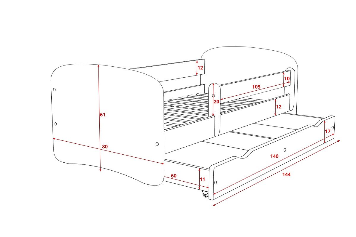 A csomagolás tartalmazza az ágyat, leesésgátlót és ágyrácsot. A leesésgátló hossza 100 cm.