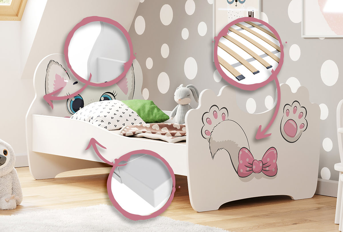 A rózsaszín cicás mintával ellátott gyerekágy tökéletes megoldás a mesés motívumok kis rajongóinak. Az ágy fej- és lábrészén található aranyos minta nemcsak alvóhelyet, hanem a gyerekszoba különleges díszét is jelenti. A finom színek és a mesés motívum vidám légkört teremtenek a belső térben, amely támogatja mind a pihenést, mind a kreatív játékot.