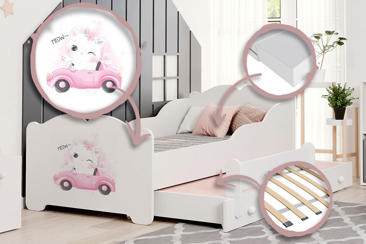 Az ágyat a kényelem és biztonság szem előtt tartásával tervezték, így ideális megoldás minden lány szobájába. Ennek a modellnek a különlegességét az elülső oldalon található finom minta hangsúlyozza, amely varázst és lányos jelleget kölcsönöz, és egyben biztonságos, tanúsított lakkokból készült. A magas minőségű anyagok, lekerekített élek és masszív szerkezet garantálják a biztonságot, míg a FLEX rugalmas lécrendszer kényelmes alvást biztosít. Két alvófelületének köszönhetően az ágy hosszú évekig szolgálhat, együtt nőve a gyermekkel.