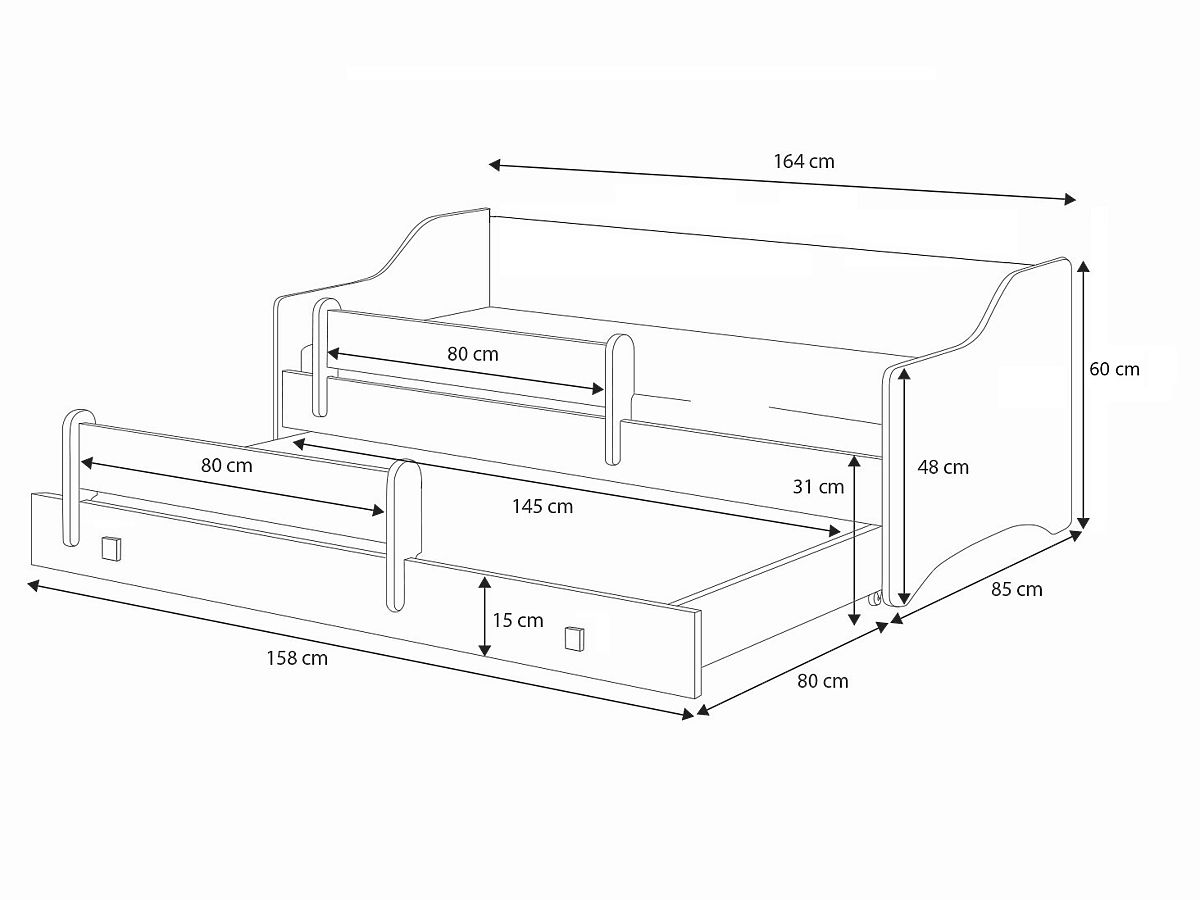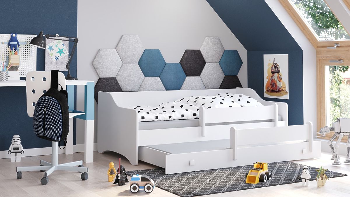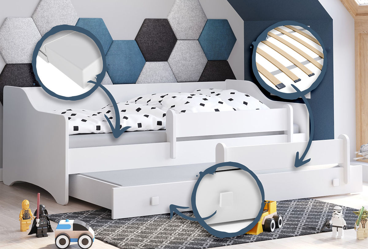 Az erős szerkezetnek és tartós anyagoknak köszönhetően az Eryk ágy stabilitást és hosszú élettartamot garantál. A lekerekített élek és a mozgatható védőkorlát biztosítják, hogy a gyermek alvás közben biztonságban legyen, a rugalmas FLEX ágyrács rugós lécekkel pedig kényelmet és megfelelő alátámasztást nyújt. Az alsó alvófelület, bár nem tárolásra szánt, ideális megoldás kényelmes alvásra testvérek vagy barátok számára, akik együtt tölthetnek időt. Az Eryk ágy az elegancia, a praktikum és a biztonság kombinációja, amely hosszú évekig szolgál majd.