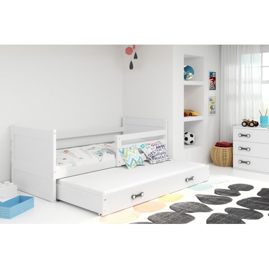 A praktikus fehér ágy pótágyazható és óvodai akadályokkal tökéletes választás a testvérek számára.