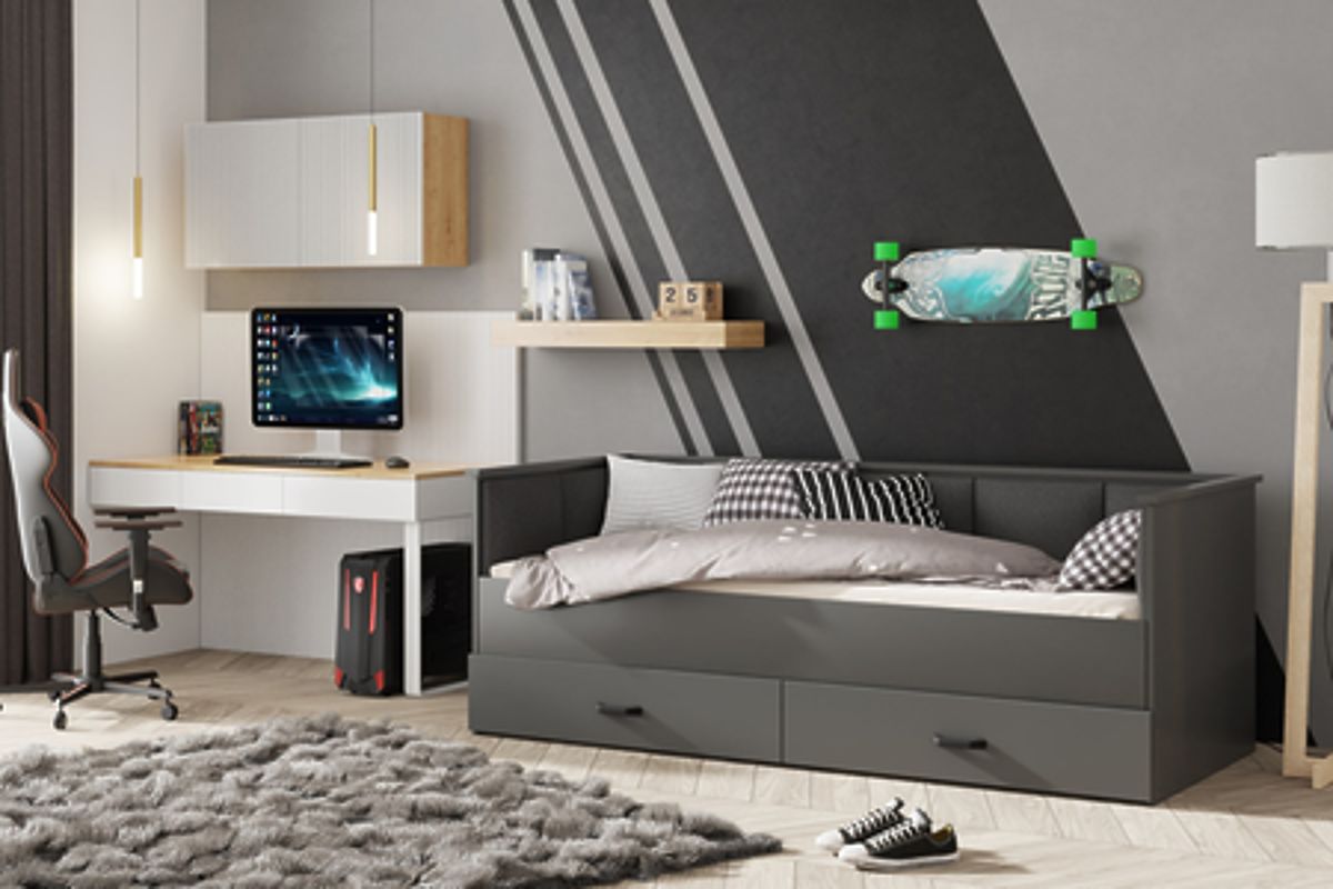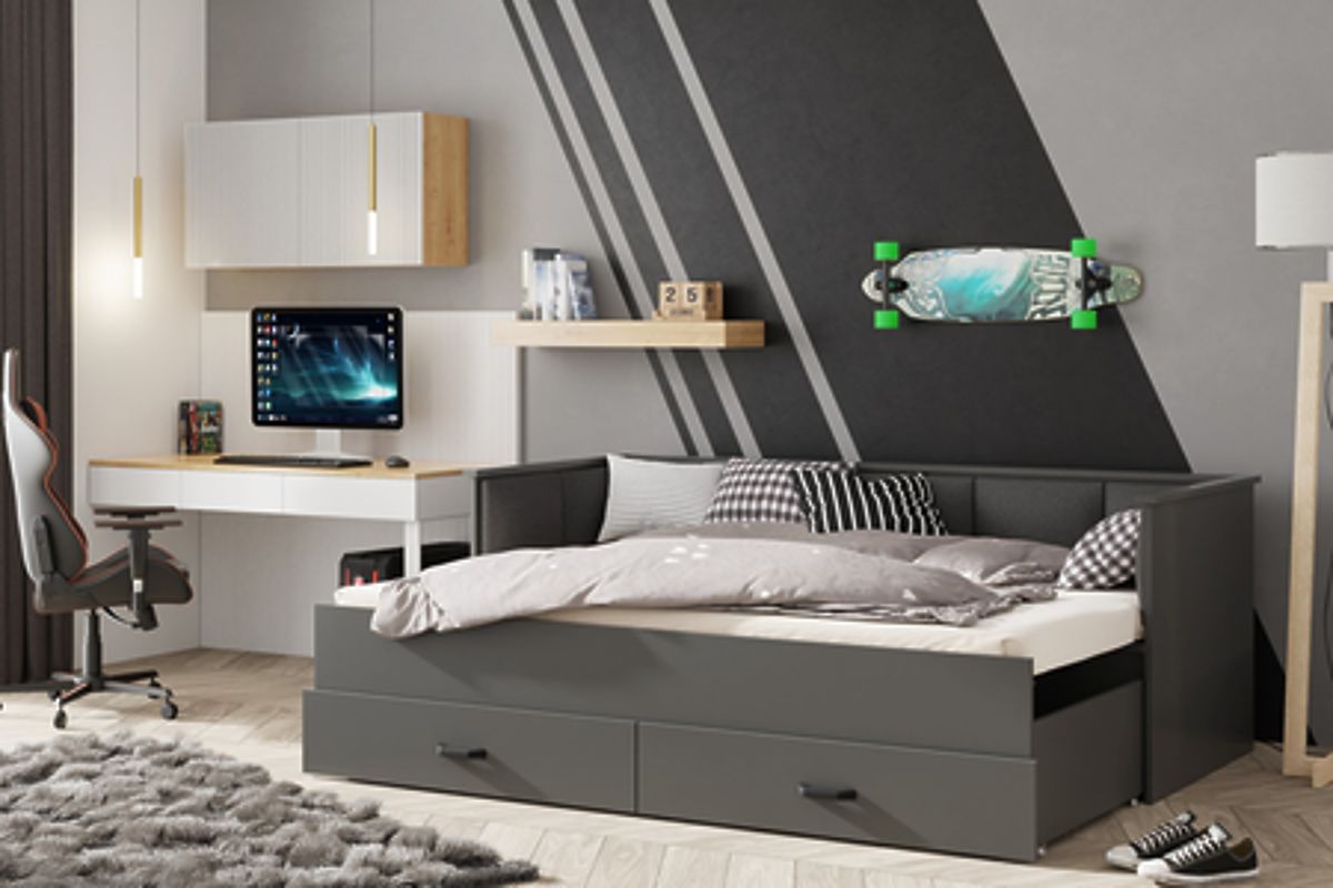 A HELIOS ágy minimalista dizájnja, amelyet kiváló minőségű bársony típusú anyagból készült kárpitozott panelek gazdagítanak, modern és elegáns jelleget kölcsönöz a belső térnek. A panelek nemcsak esztétikai kiegészítők, hanem praktikus elemek is, amelyek kényelmes támaszt nyújtanak olvasás, tévénézés vagy tanulás közben. A puha és kellemes tapintású anyag melegséget és otthonosságot ad, kiemelve az ifjúsági szoba barátságos jellegét. Az ágy továbbá két tágas, golyóscsapágyas fiókkal van felszerelve, amelyek lehetővé teszik az ágynemű, ruhák vagy egyéb apróságok tárolását. Ez a megoldás nemcsak a rend fenntartását segíti, hanem optimálisan kihasználja a teret, ami különösen fontos kisebb szobákban.
