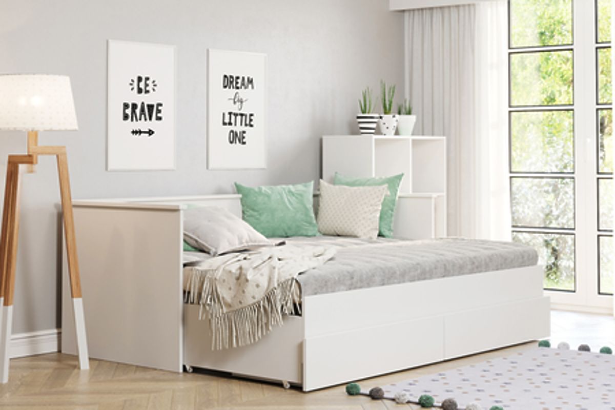 A HELIOS ágy egy modern, kihúzható ifjúsági ágy, amely esztétikát ötvöz a praktikus funkciókkal. Az alsó alap gyors kihúzásával kétszemélyes ággyá alakítható, így ez a bútor tökéletesen illik mind kis, mind tágas szobákba. Univerzális, fehér színű kialakítása minden belső stílushoz alkalmazkodik, frissességet és eleganciát kölcsönözve neki.