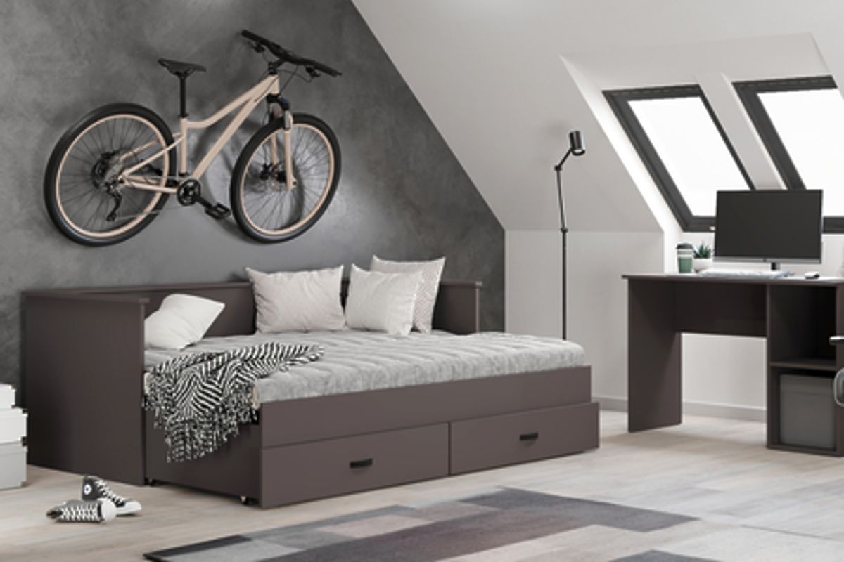 A HELIOS ágy egy modern, kihúzható ifjúsági ágy, amely elegáns megjelenést ötvöz praktikus funkciókkal. Az alsó alap kihúzásával gyorsan átalakítható kétszemélyes ággyá, így ez a bútor ideális mind kis, mind tágas szobákba. Univerzális, szürke színű kialakítása minden belső stílushoz illik, modern jelleget és finom eleganciát kölcsönözve neki.