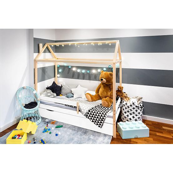 A Paul házikóágy - a természetes fenyőfa és a fehér szín kombinációja. A színek gyönyörű harmóniájának köszönhetően ez a házikóágy mind lányok, mind fiúk számára egyaránt alkalmas. A Paul- skandi házikóágy része egy leesésgátló és egy fából készült ágyrács.