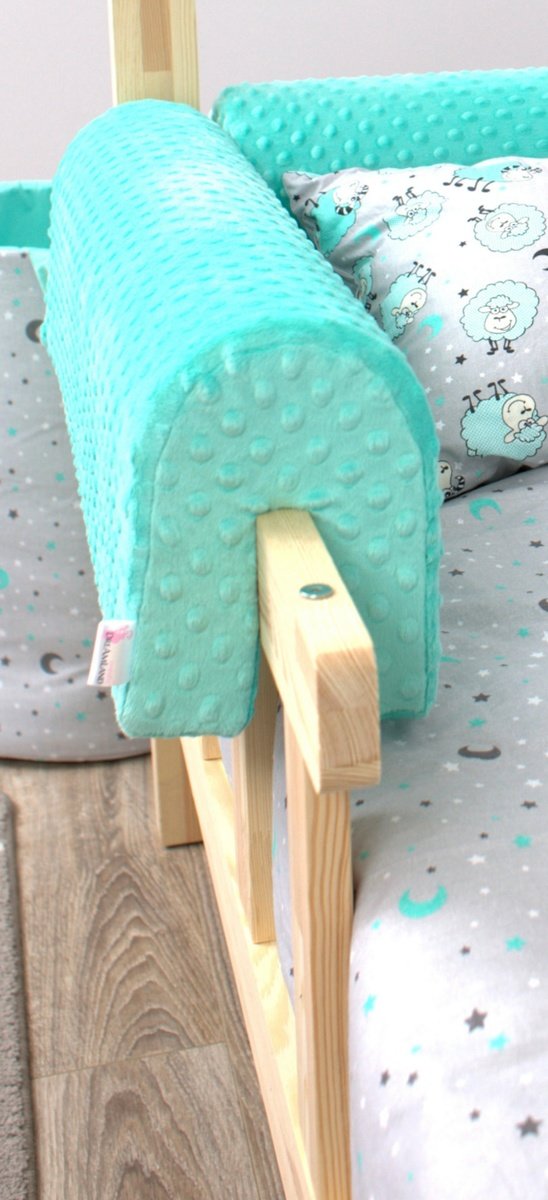 Világoskék ágyvédő, amely biztosítja a gyermek biztonságát. .. többet