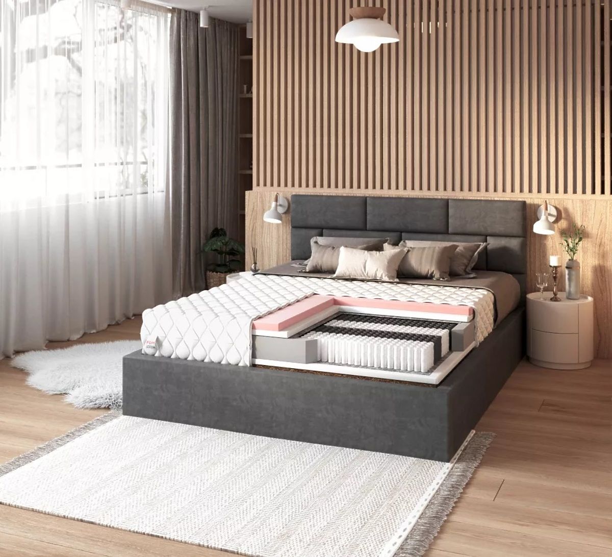 A rugók NanoHard technológiával készülnek, ami garantálja az erőt és meghosszabbítja az élettartamot. A második réteg tartós és rugalmas purhab , amely jó párnázást és jó minőségű gerinctámaszt biztosít. Tested tökéletesen alkalmazkodik a matrachoz, és reggel kipihenten és kipihenten ébredsz. Ezenkívül a VISCO hőre lágyuló hab az alakmemóriának köszönhetően páratlan kényelmet és kényelmet biztosít. Tökéletesen feltérképezi a testet, majd később visszatér eredeti állapotába. A további légáteresztés érdekében kókusz betétet használtak, amely természetes anyagként kissé megerősíti az egész szerkezetet. A rugók és a hab közé elválasztó anyagot helyeztek. Ez egy természetes filc, amely jelentősen meghosszabbíthatja a matrac élettartamát és megerősítheti szerkezetét.