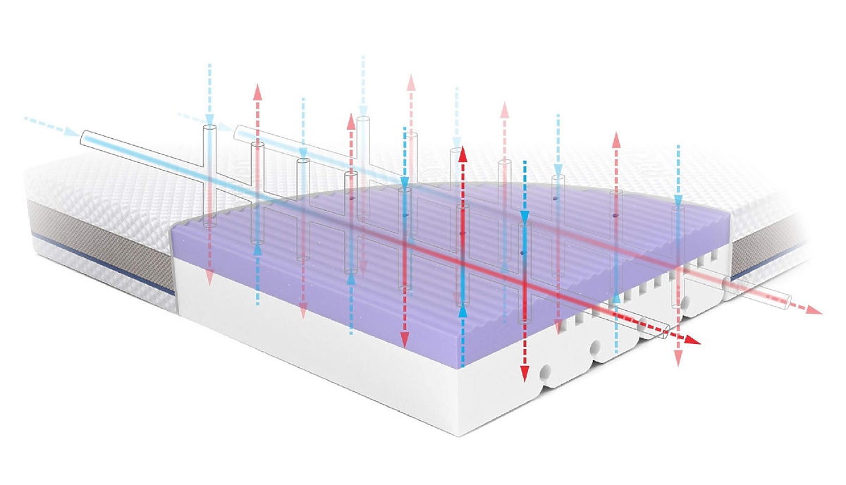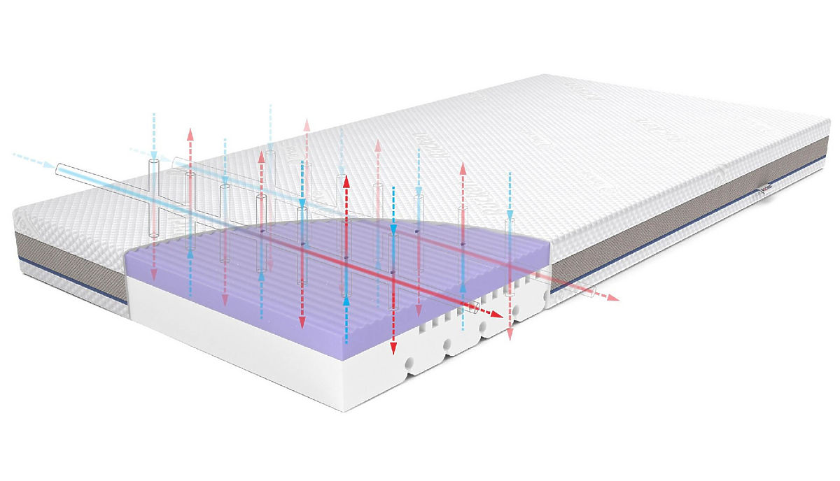A huzatháló és a függőleges és vízszintes csatornák teljesen integráltak - ennek köszönhetően kiterjesztett háló jön létre, és a matrac lélegzik.