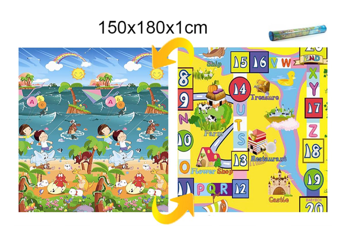 A gyerekszőnyeg öt rétegből tevődik össze. A laminált felső rétegre tarka színekkel van nyomtatva a minta és könnyen mosható. A habréteg hőszigetelt és eséskor megvédi gyemekét. Ezután következik a második réteg és a fólia.