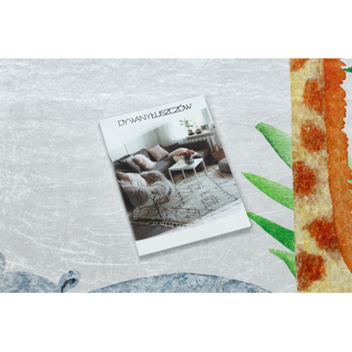 Teremtsen vidám és játékos hangulatot a gyerekszobában a BAMBINO 54090 mosó téglalap alakú szőnyeggel, amely afrikai állatok motívumával rendelkezik. A fehér és zöld színek kombinációja örömteli és inspiráló elemet hoz a helyiségbe, amely ideális játékhoz, pihenéshez és kreatív tevékenységekhez. A szőnyeg 100% poliészterből készült, amely kellemes tapintású, tartós és könnyen karbantartható. Az 5 mm-es vastagságnak és a 0,70 kg/m² súlynak köszönhetően könnyű, kényelmes és stabil a padlón. Praktikus előnye a mosógépben való moshatóság, ami jelentősen megkönnyíti a karbantartását és tisztán, frissen tartja a szőnyeget. A csúszásmentes bevonat biztosítja a biztonságot játék közben és minimalizálja a csúszás kockázatát.