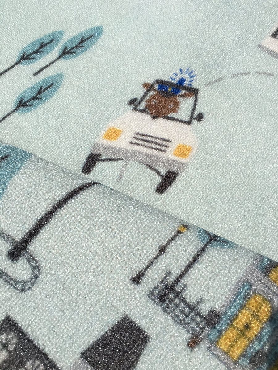 Luxus menta szőnyeg utakkal, autókkal és épületekkel a német LIVONE társaságtól a gyerekszobába