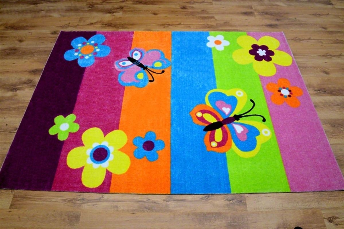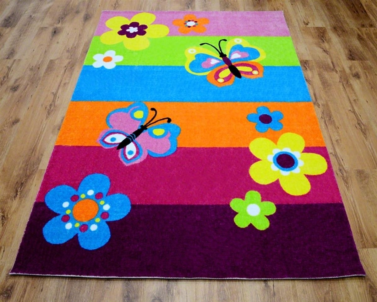 Az ön kis hercegnője is szereti a színeket, a virágokat és a lepkét? Akkor biztosan örülni, fog ennek a csodálatos és színes gyerek szőnyegek! A szőnyeg kék, zöld, narancssárga, rózsaszín, sötét rózsaszín és lila színek kombinációja. Ez a szőnyeg garantáltan felvidítja a gyerekszobát, melybe játékosságot és vidámságot varázsol.