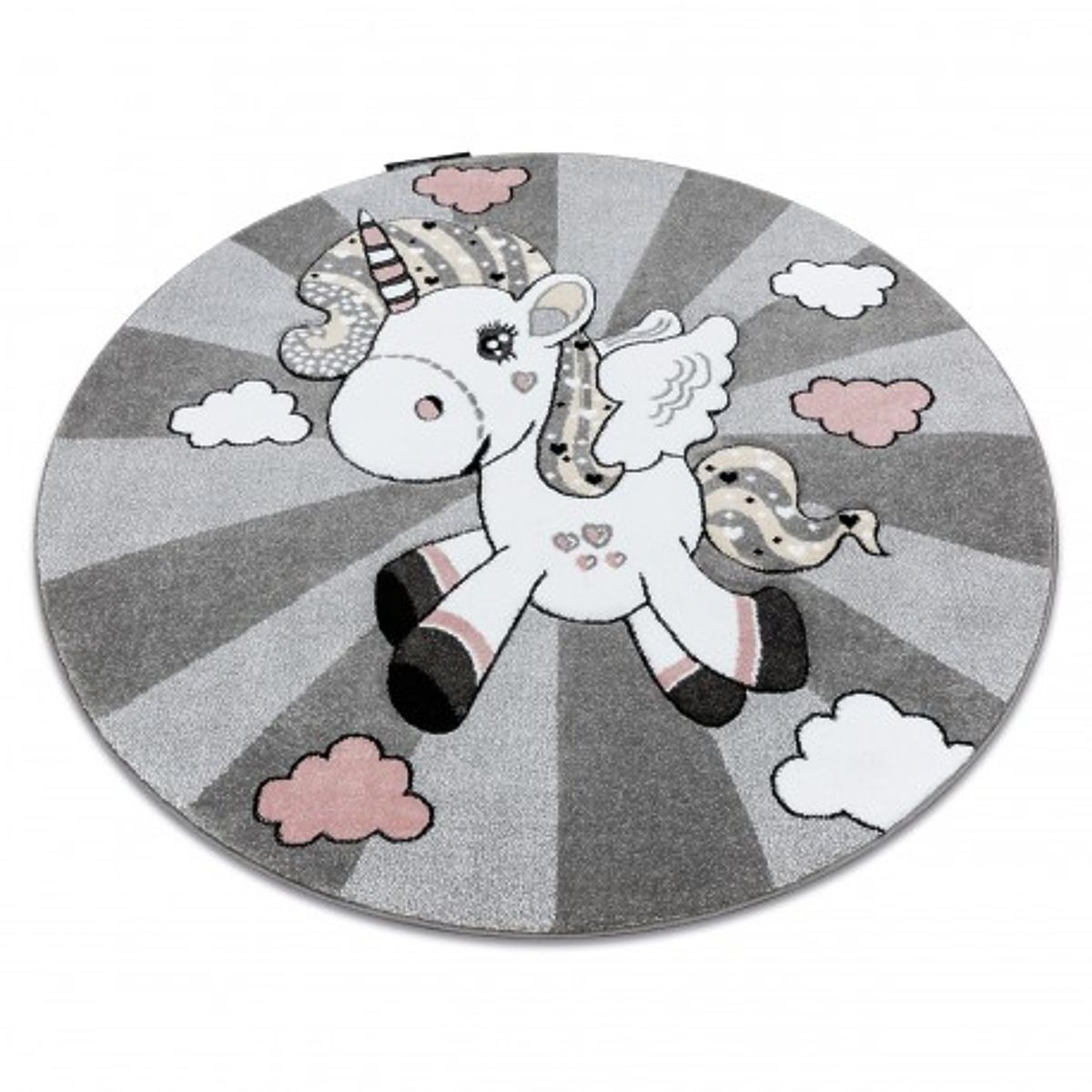 Kerek szőnyeg aranyos egyszarvú mintával, szürke háttérrel. .. többet