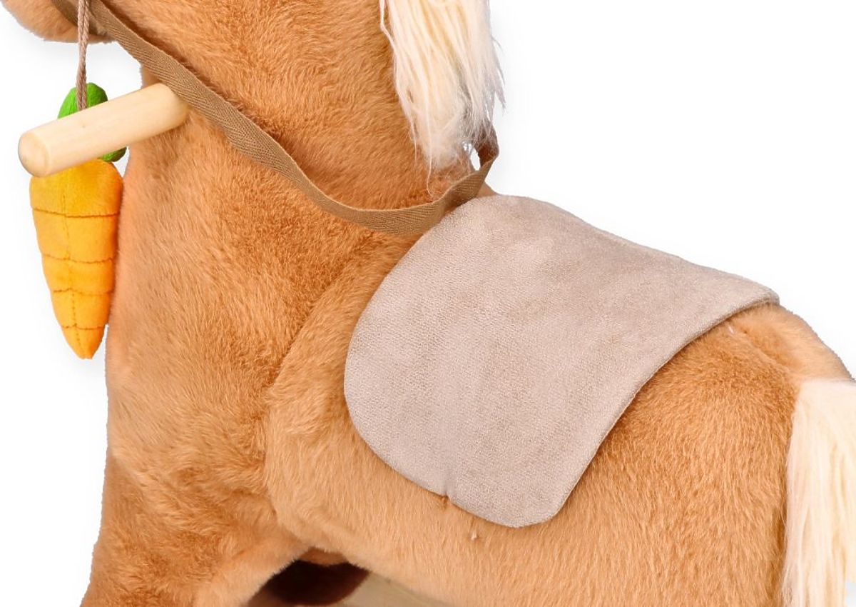 A gyönyörű lovacska kiemelkedik a hasonló termékek közül. Rendkívül puha anyagból készült, hogy ne csak ülni legyen rajta kellemes, hanem hozzábújni is. Vidám arckifejezéssel, nyereggel, világos sörénnyel és farokkal igazán aranyosnak tűnik.