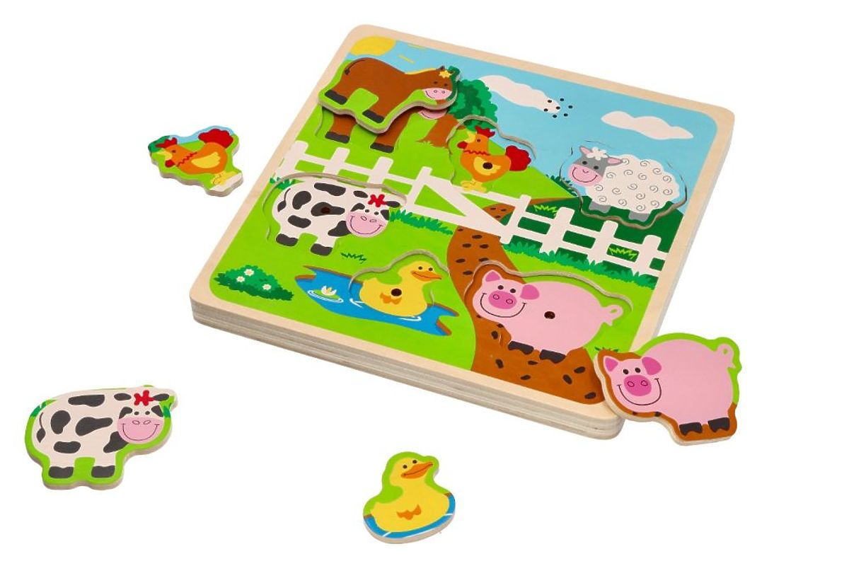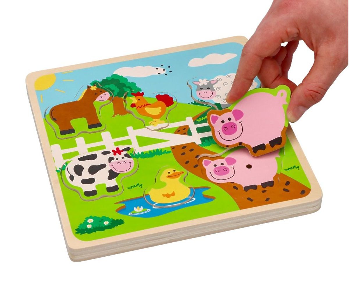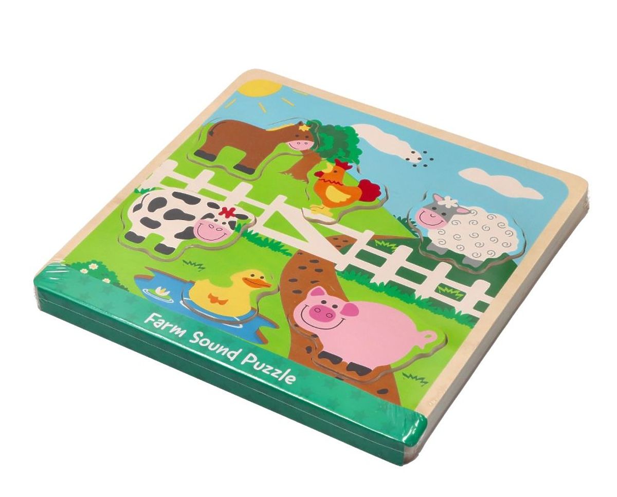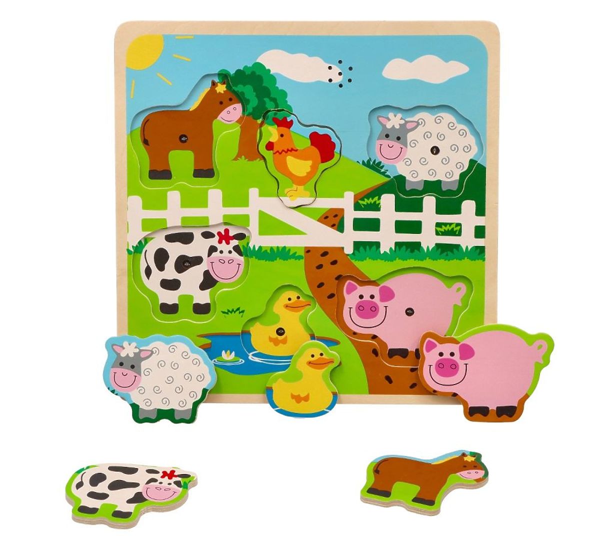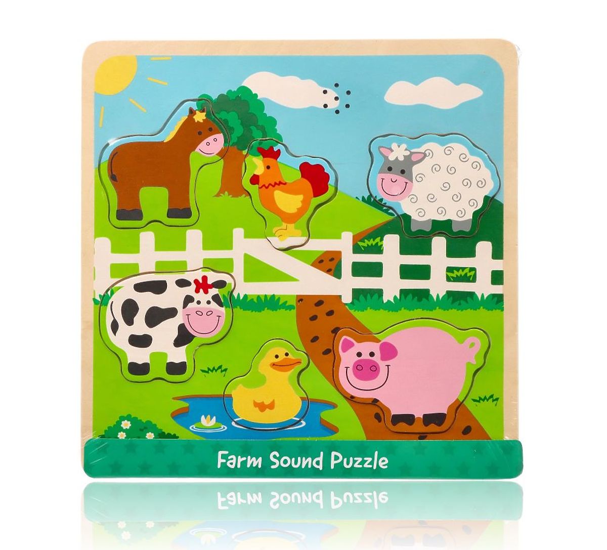 Segítesz a farm állatainak megtalálni a helyüket? Teljesen új, fából készült hangos kirakót kínálunk farm állatokkal. A gyermek játék közben a kirakó darabjait az üres helyekre illeszti. Hang hallható, amikor a darab a megfelelő helyre kerül.