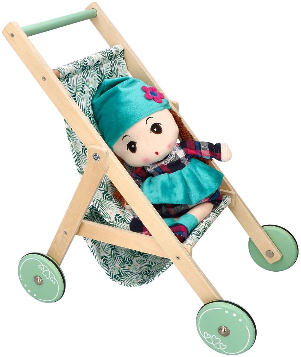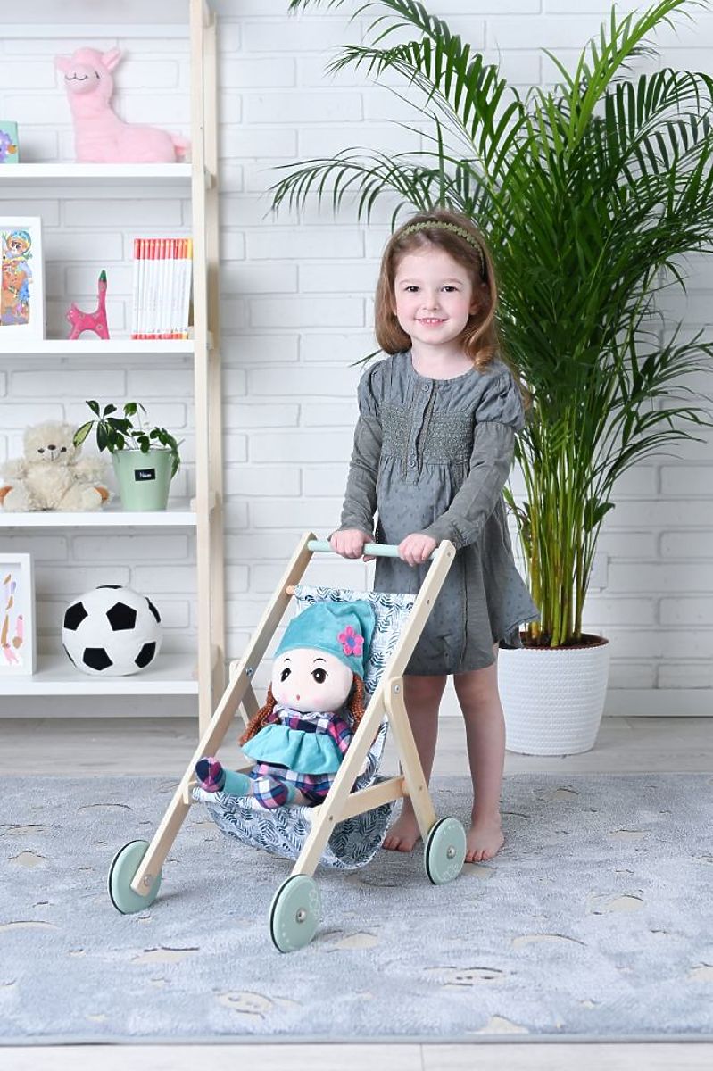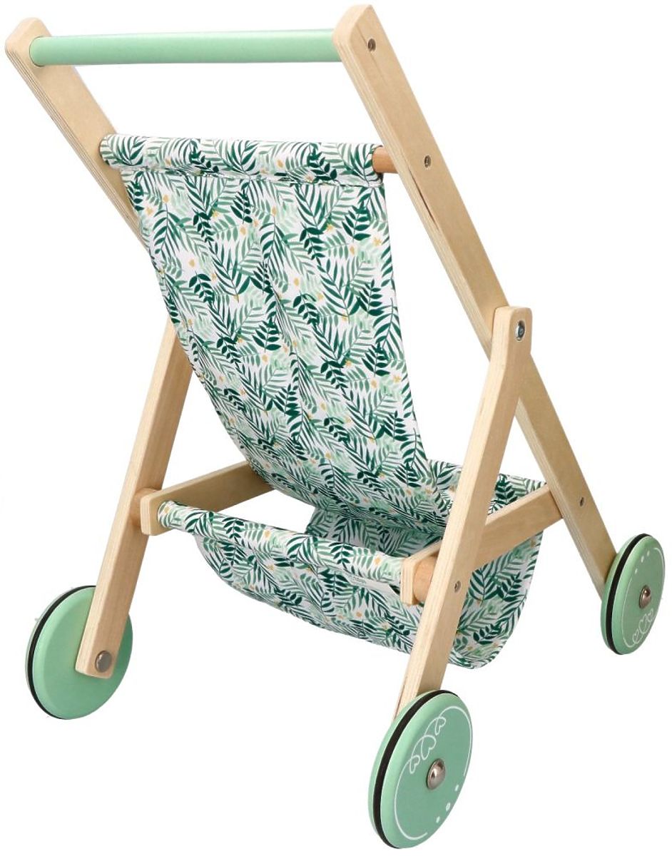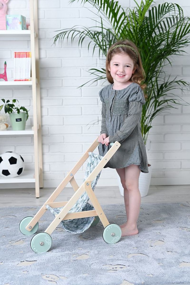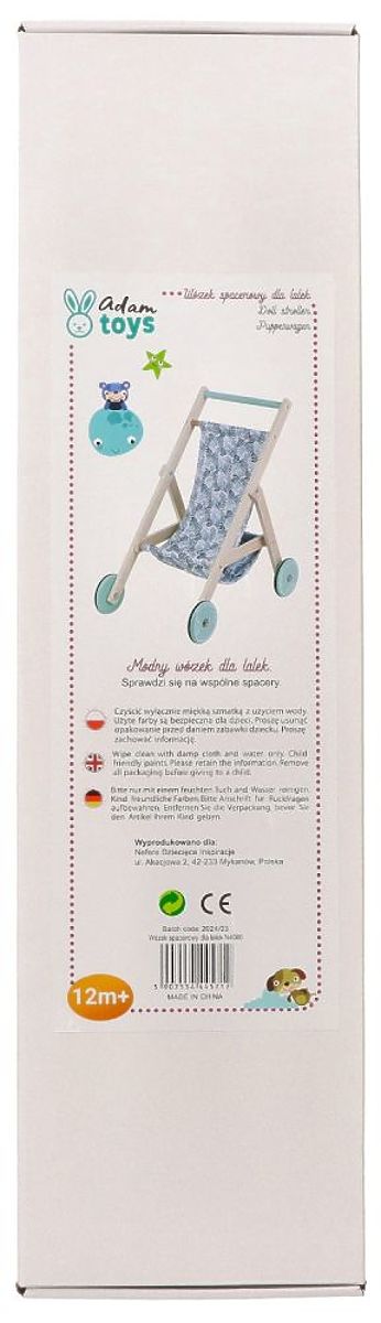 A könnyű, fa babakocsi babák számára az AdamToys új tervezése a nyári sétákhoz a gyermek kedvenc babáival. Mostantól a séták különleges élménnyé válnak a babakocsi bájos megjelenésének és könnyű szerkezetének köszönhetően. A babakocsi nagyon simán tolható a nagy kerekek gumírozott csúszásgátló szalagjainak és alacsony súlyának köszönhetően. A babakocsi fából készült, mentás akcentusokkal a kerekeken és a fogantyún. A baba vagy a mackó a gyönyörű zöld ágakkal díszített ülésen ülhet. Az összkép nagyon bájos, és biztosan sok tekintetet vonz majd a sétányon és a játszótéren.