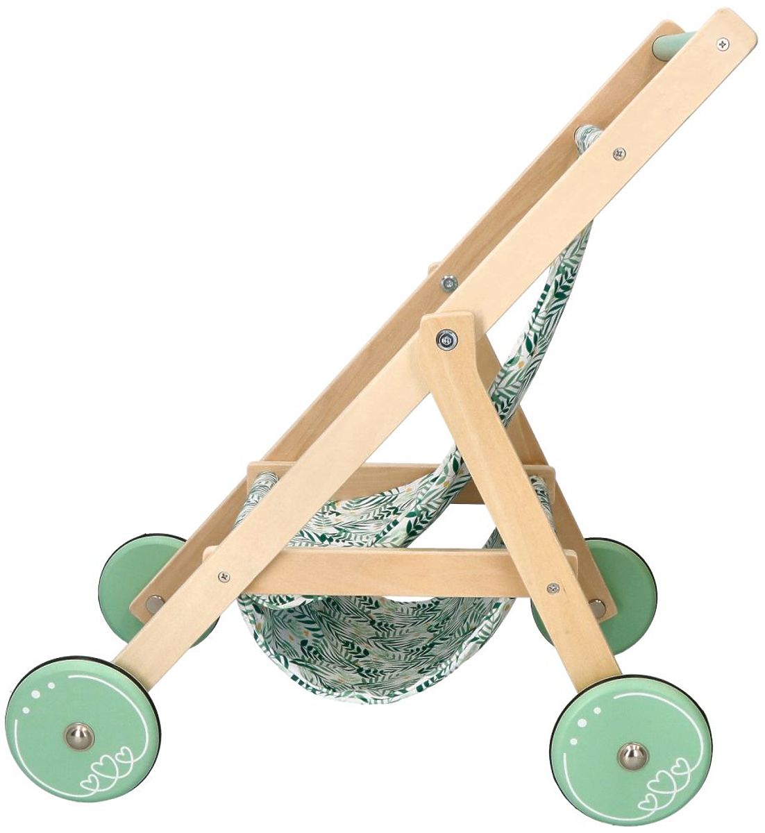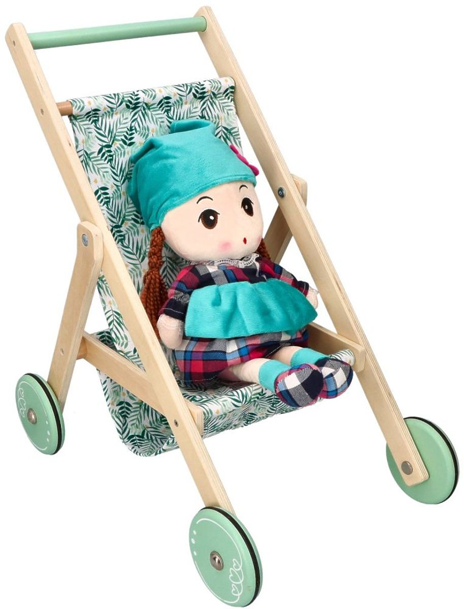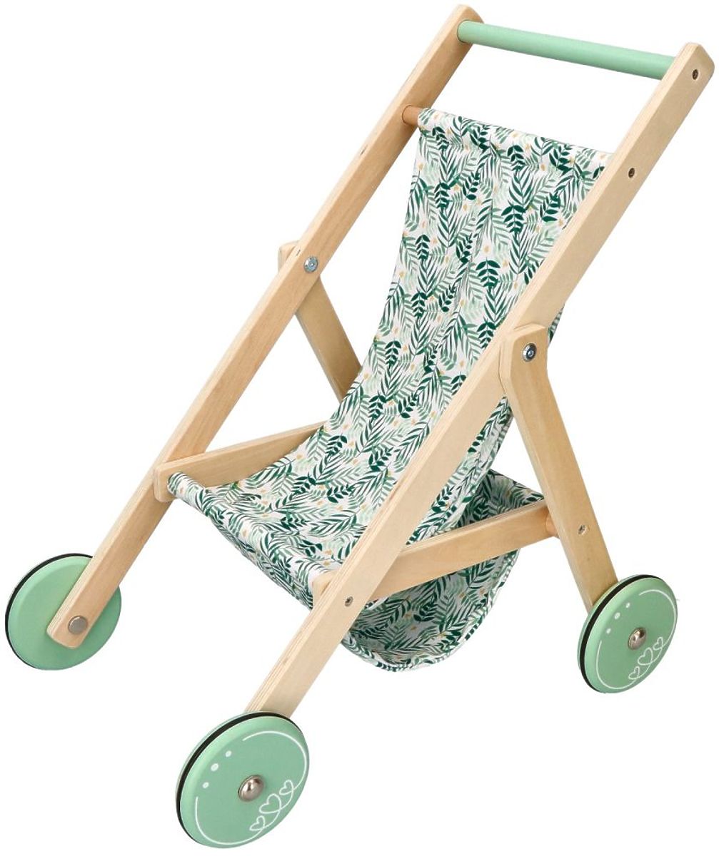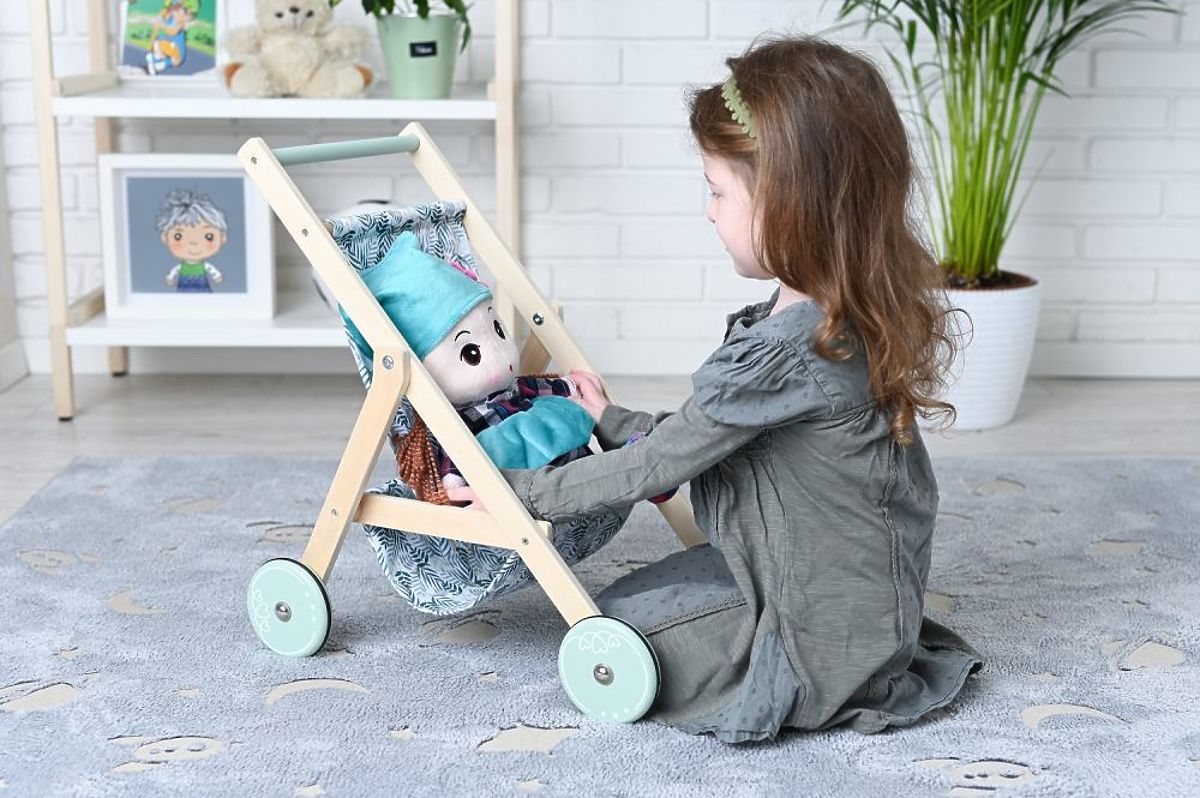 A könnyű, fa babakocsi babák számára az AdamToys új tervezése a nyári sétákhoz a gyermek kedvenc babáival. Mostantól a séták különleges élménnyé válnak a babakocsi bájos megjelenésének és könnyű szerkezetének köszönhetően. A babakocsi nagyon simán tolható a nagy kerekek gumírozott csúszásgátló szalagjainak és alacsony súlyának köszönhetően. A babakocsi fából készült, mentás akcentusokkal a kerekeken és a fogantyún. A baba vagy a mackó a gyönyörű zöld ágakkal díszített ülésen ülhet. Az összkép nagyon bájos, és biztosan sok tekintetet vonz majd a sétányon és a játszótéren.