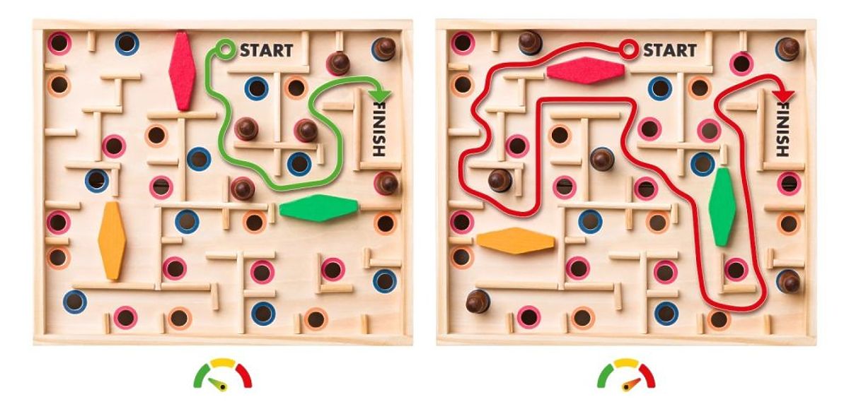 A működési elv nagyon egyszerű - a golyót a "START" felirattal jelölt kezdőmezőtől a "FINISH" felirattal jelölt célmezőig kell eljuttatni. És itt ér véget ennek a szórakoztató játéknak az egyszerűsége, mert a golyó nagyon simán mozog a labirintusban, és könnyen beleesik egy lyukba - ezt el kell kerülni. A labirintus teljes hosszában lyukak vannak elhelyezve. Gyakran ezek a sarkokban vagy olyan helyeken találhatók, ahol manőverezés szükséges, ami még nehezebbé teszi a játékot. Szerencsére a készletben található 6 figura, amellyel eldughatja a "leggyűlöltebb" lyukakat vagy bármely másikat. A felhasznált figurák száma tetszőleges, az első játékok során használhatja mindet vagy nagyobb számot. Ahogy tapasztalatot szerez, fokozatosan csökkentheti a figurák számát, vagy teljesen elhagyhatja őket, és bevezethet egy új "hardcore" szintet :)