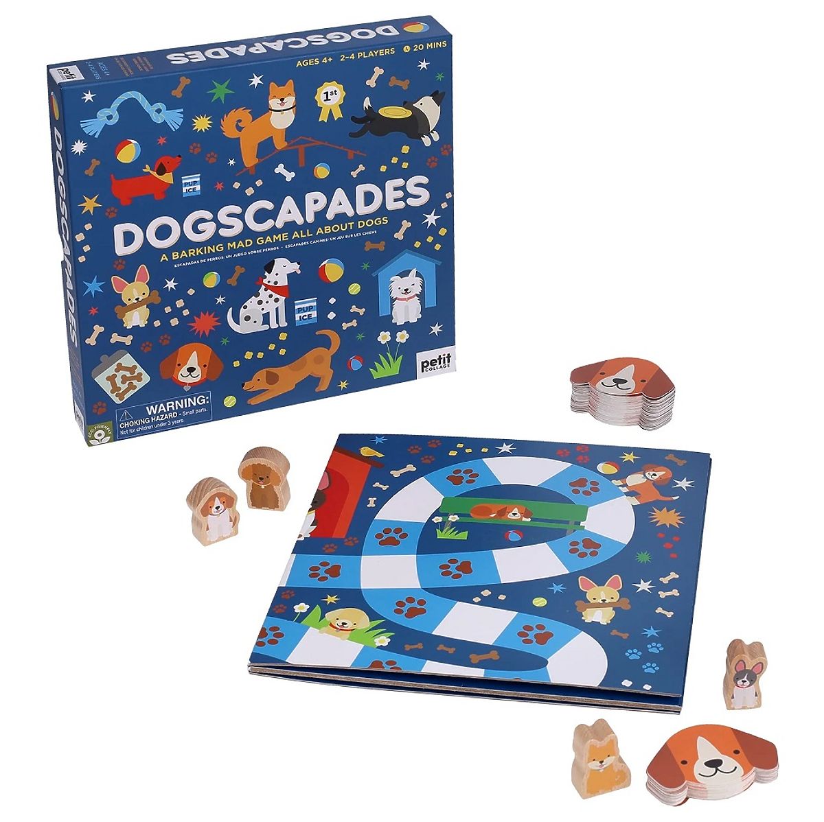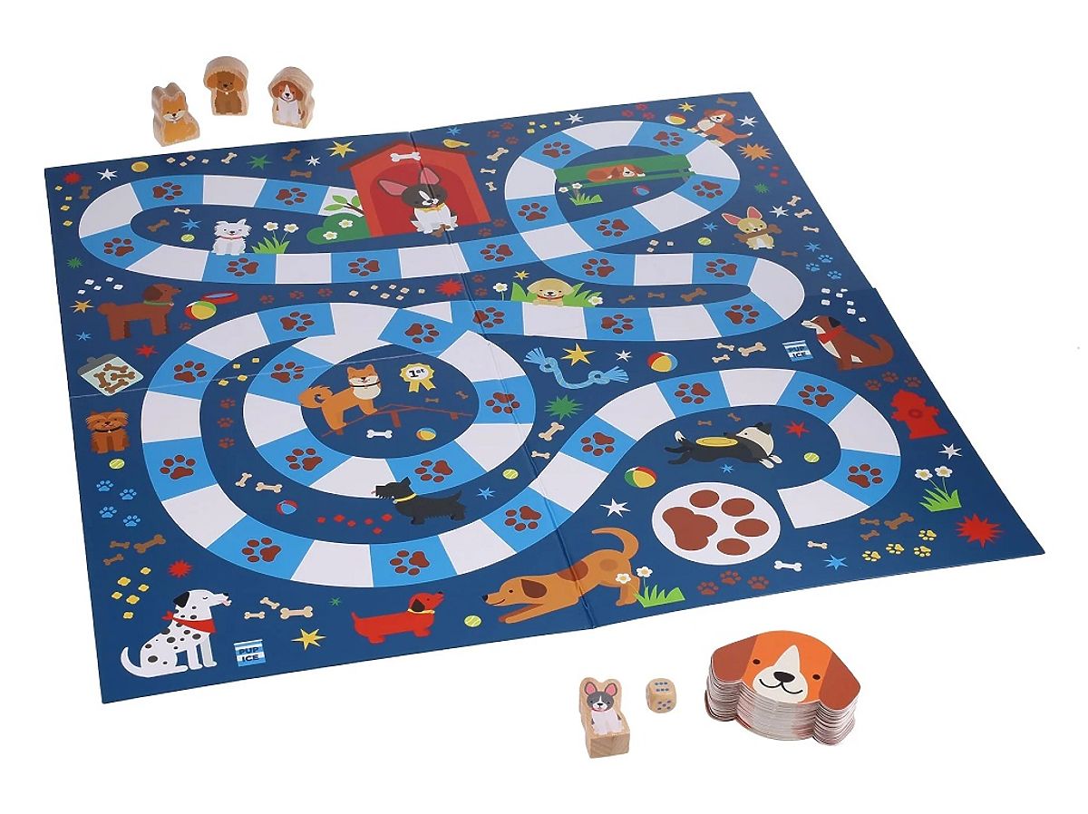 Ez az akciódús játék a szőrös négylábú barátokról éberen tart! Teszteld a kutyákkal kapcsolatos ismereteidet, és mutasd meg mindazt, ami a kutyákkal kapcsolatos, miközben a kutyafigurádat a játéktáblán mozgatod. Tudsz ugatni, mint egy boldog kutya? Tudsz kergetőzni a farkaddal, mint egy kölyökkutya? Légy te az első, aki célba ér. Tökéletes családoknak, barátoknak és kutyabarátoknak, valamint minden társasjáték-rajongónak. Az átlagos játékidő 20 perc. A játék alkalmas az angol nyelv gyakorlására. A társasjátékok nagyszerű módjai annak, hogy a gyerekeket megtanítsák a türelem, a koncentráció, a győzelem és a vereség méltóságteljes elfogadásának értékeire, valamint arra, hogyan játszanak másokkal. A kisebb gyerekeknél emellett fejleszti a játéktáblán való mozgást, a kéz-szem koordinációt és az ügyességet. A játék menete: az a játékos kezd, aki utoljára simogatott meg egy kutyát. Dobd el a kockát, és lépj a kutyafiguráddal a megjelenített mezők számával. Ha kutyamancsra lépsz, húzz egy kártyát. A kártya arra kér, hogy teszteld a kutyákkal kapcsolatos ismereteidet, vagy mutass be valamit, ami a kutyákkal kapcsolatos – például ugass, mint egy boldog kutya, vagy kergetőzz a farkaddal, mint egy kölyökkutya! Teljesítsd az akciót, és lépj a figuráddal a kártyán megadott mezők számával. Ha nem sikerül, semmi gond, egyszerűen a következő játékos következik. Az nyer, aki elsőként ér célba! A játék tartalma: 150 játékkártya (50 nyelvenként – angol, francia, spanyol), 4 fa kutyafigura, 1 illusztrált játéktábla, 1 fa kocka. A fa figurák és a dobókocka FSC® tanúsítvánnyal rendelkező fából készültek. A csomagolás, a játéktábla és a játékkártyák FSC® papírra vannak nyomtatva növényi tintákkal. Főbb jellemzők: átlagos játékidő 20 perc újrahasznosított anyagokból készült növényi tintákkal nyomtatva 50 kártya nyelvenként - angol, francia, spanyol játék 2-4 játékos számára 4 éves kortól