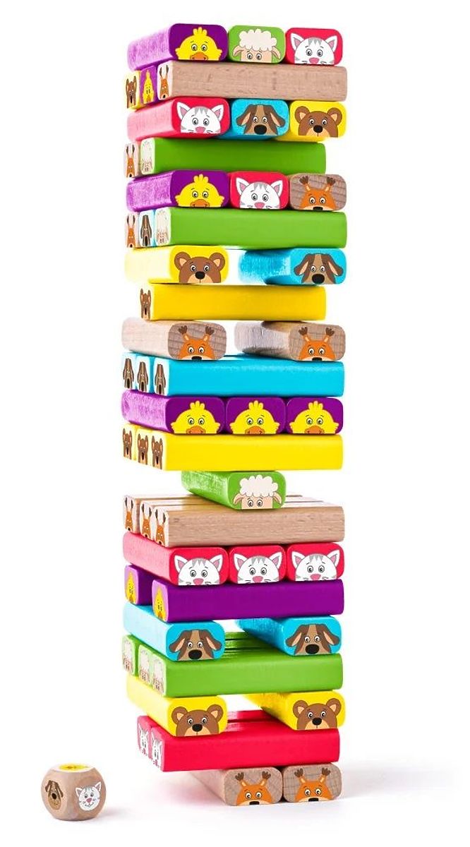 I- könnyebb verzió: tornyot építünk, minden játékos dob a kockával, és kihúzza a toronyból a dobott állatnak megfelelő lapocskát, majd a torony tetejére helyezi úgy, hogy az ne dőljön össze, aki ledönti a tornyot, veszít;