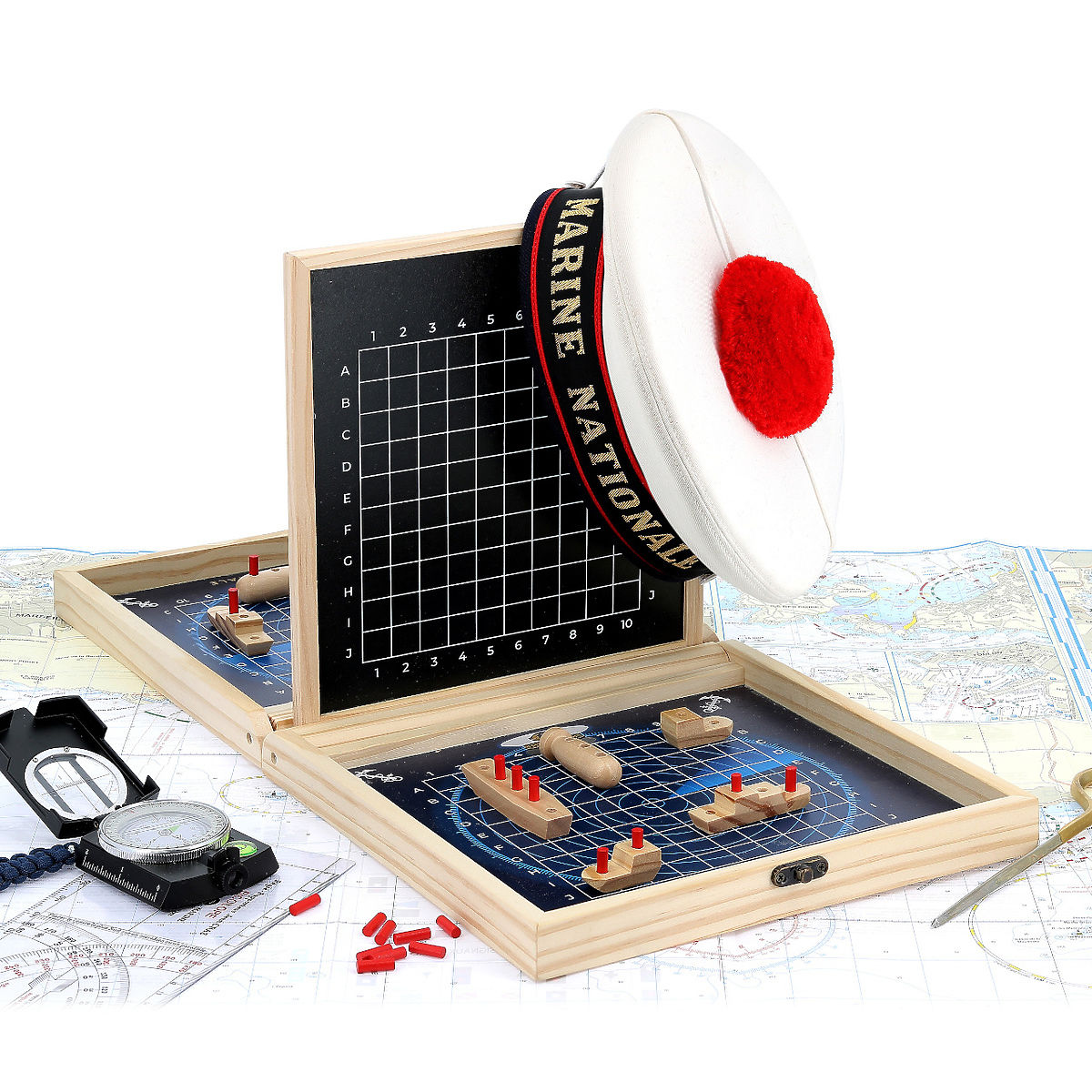 Egy klasszikus stratégiai játék egy hordozható fa tokban, a francia haditengerészet motívumaival, szórakoztató módon segítheti a gyerekek kognitív képességeinek .. többet