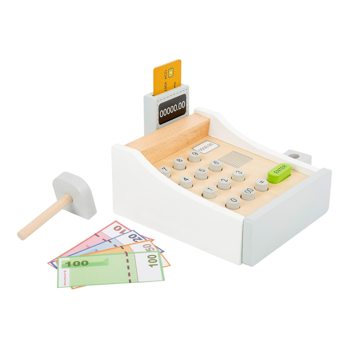 Csak ömlik a pénz! Ez a gyönyörű fa pénztárgép minden jól szervezett gyermekboltban megtalálható. A játék ezzel a játékkal segít a gyerekeknek megérteni az áruk árait és a pénzkezelést. Az alkatrészek játékjegyek és fa hitelkártyák, amelyek kényelmesen elférnek az alsó fiókban. A megvásárolt áru ára a billentyűzeten írható be. Ki a következő?