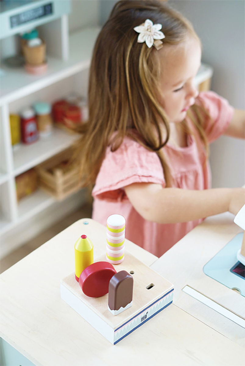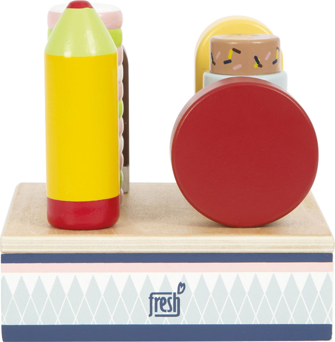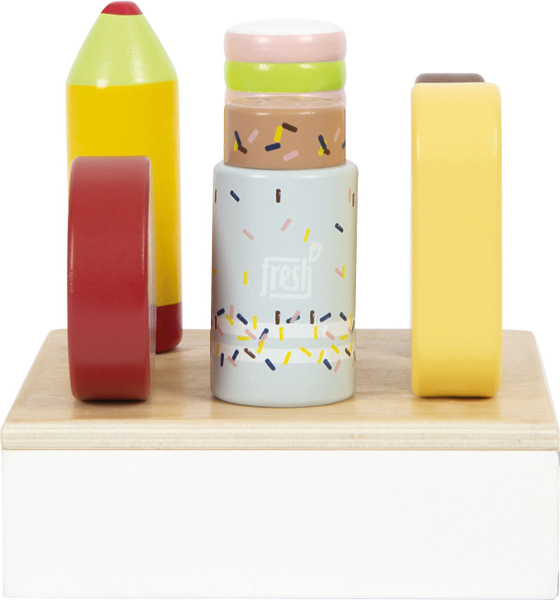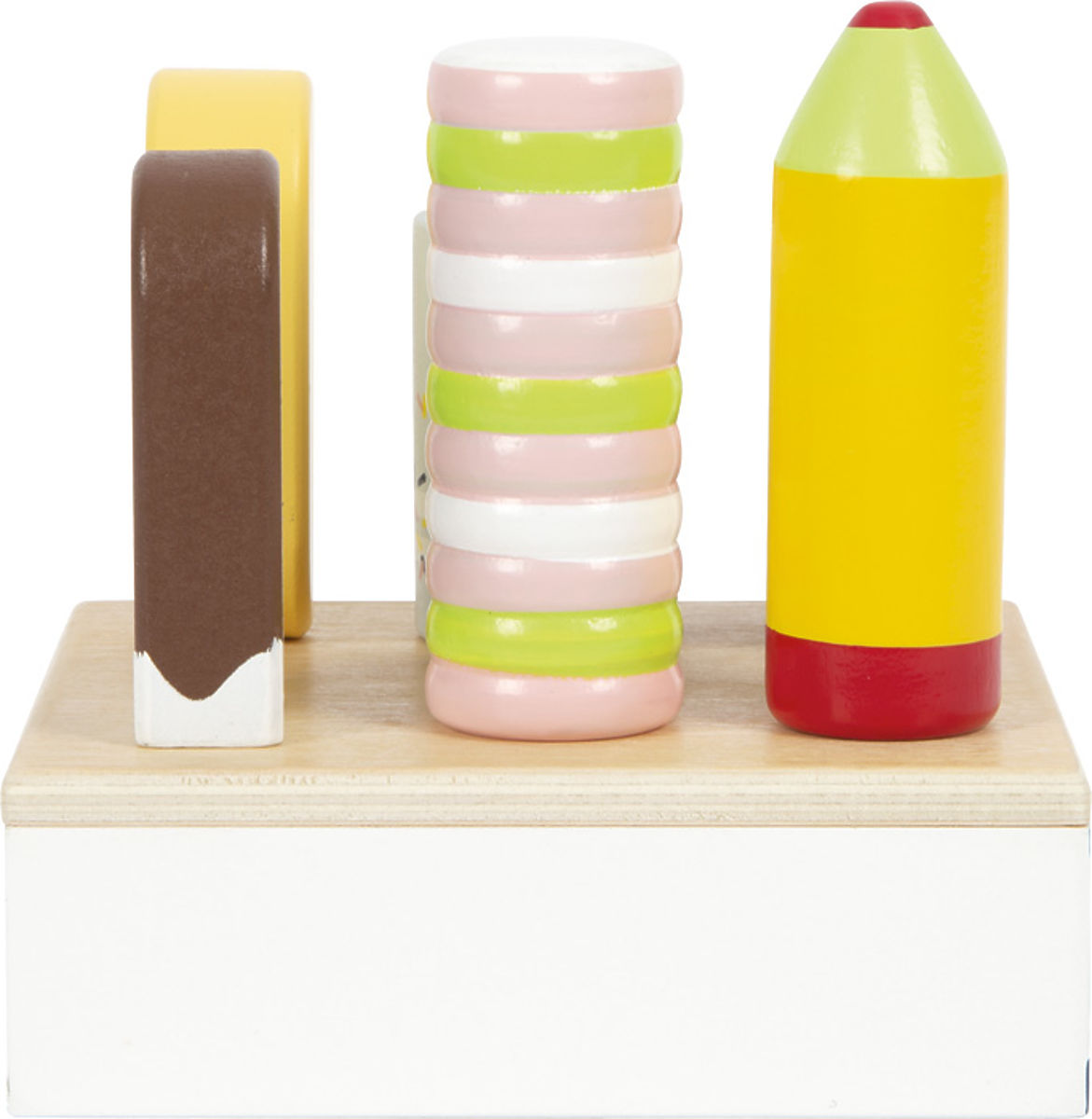 Jégkrém készlet kis fagylaltárusoknak. Ez a praktikus fagylaltállvány 6 különböző íz számára biztosít helyet, és frissítő fagylaltárus érzést hoz az élelmiszerboltba vagy a gyerekkonyhába. Gondoskodik arról is, hogy a hideg finomságok megfelelő stílusban kerüljenek felszolgálásra. Minden egyes fagylalt FSC® tanúsítvánnyal rendelkező fából készült, és nagyon hasonlít valódi megfelelőjére. A finom színezés és a magas látható fa arány igazi látványossággá teszi ezt a játékkészletet a gyerekszobában. Minden gyermek szereti a jégkrémet! Az utazáshoz legkedveltebb fagylaltváltozat nem hiányozhat egyetlen gyerekszobából sem. A fagylaltstand kialakítása és mérete összhangban van a kompakt „friss” fagylaltpulttal (12416), így ideálisan kiegészítik egymást. Főbb jellemzők: 6 különböző fagylaltfajta, tartós FSC® fából készült, ideális a kompakt „friss” fagylaltpulthoz (12416), népszerű kiegészítő a gyerekkonyhákhoz és élelmiszerboltokhoz. Az FSC® (Forest Stewardship Council) márka és tanúsítvány garantálja, hogy a termékhez használt fa nem illegálisan lett kitermelve, és fenntartható vagy természetközeli módon kezelt erdőkből származik, ahol szigorú környezeti és szociális követelményeknek tesznek eleget. Az FSC® jelzés a terméken azt jelenti, hogy vásárlásával hozzájárul az erdők védelméhez és támogatja a fenntartható, felelős vagy természetközeli gazdálkodást, amelynek köszönhetően erdeink stabilabbak, egészségesebbek, természetes fajösszetételűek és jobban ellenállnak az éghajlatváltozás negatív hatásainak.