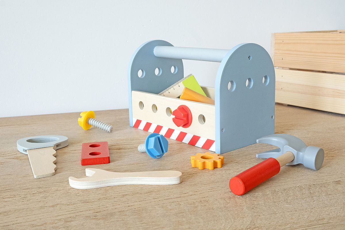 A fából készült szerszámos doboz kreatív szórakozási formát kínál a kis barkácsolóknak. A valósághű eszközök fejlesztik a gyerekek logikáját, finommotorikáját és elősegítik a technológia megértését.