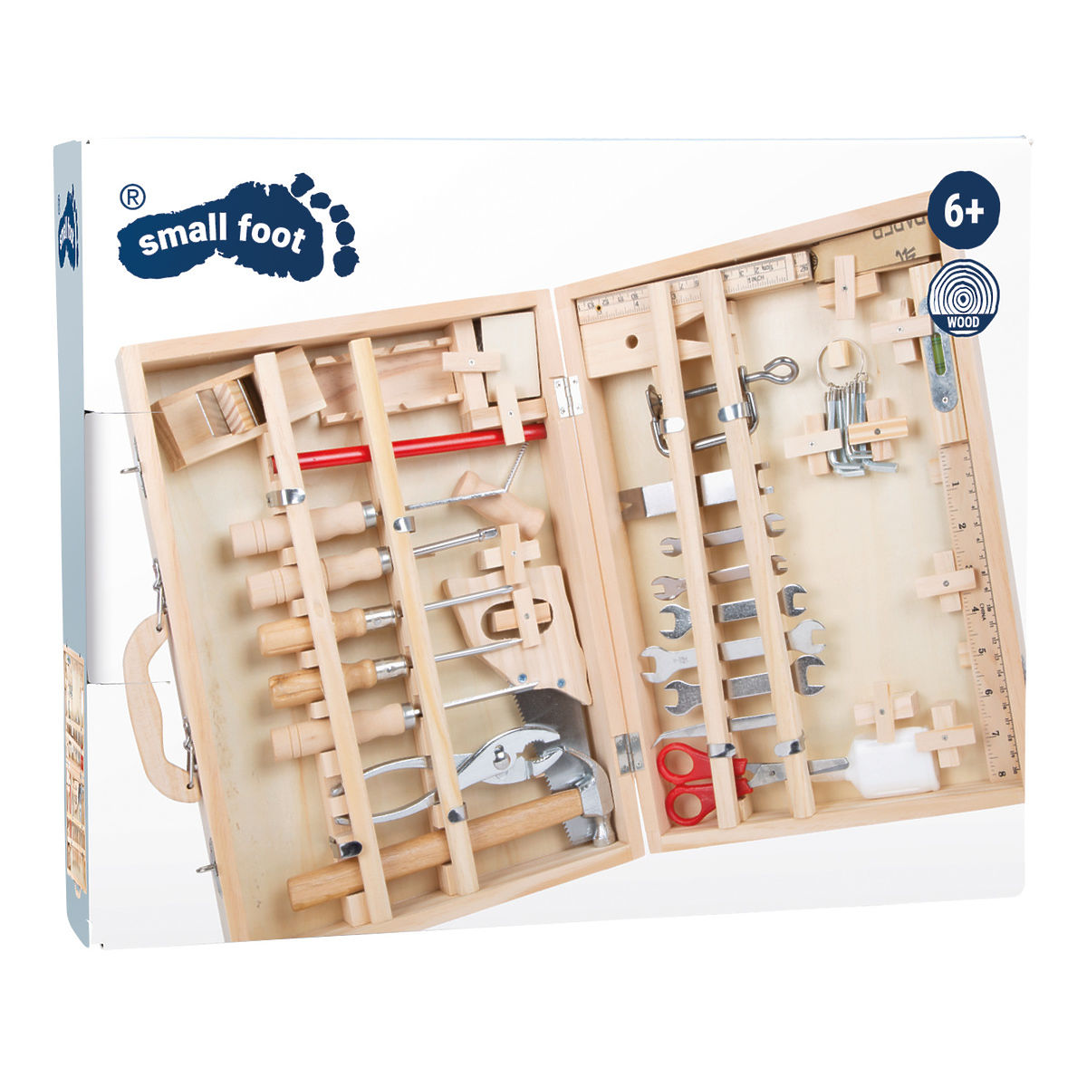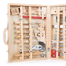 A Deluxe Case egy átfogó szerszámkészlet: 48 részből álló függő fadoboz kis barkácsolóknak! A Deluxe tokban minden szükséges fa és fém szerszámot megtalál mindenféle munkához és javításhoz. Találsz benne csavarkulcsokat, csavarhúzókat, fűrészt, ollót, vésőt, asztalos ceruzát, hatlapfejű kulcsot, kalapácsot és még sok minden mást! Minden elemnek megvan a maga helye a tokban, minden alkatrész biztosítékkal van felszerelve, amely a helyén tartja. Főbb jellemzők: Az átfogó készlet 48 részből áll. Praktikus fa tok tároláshoz