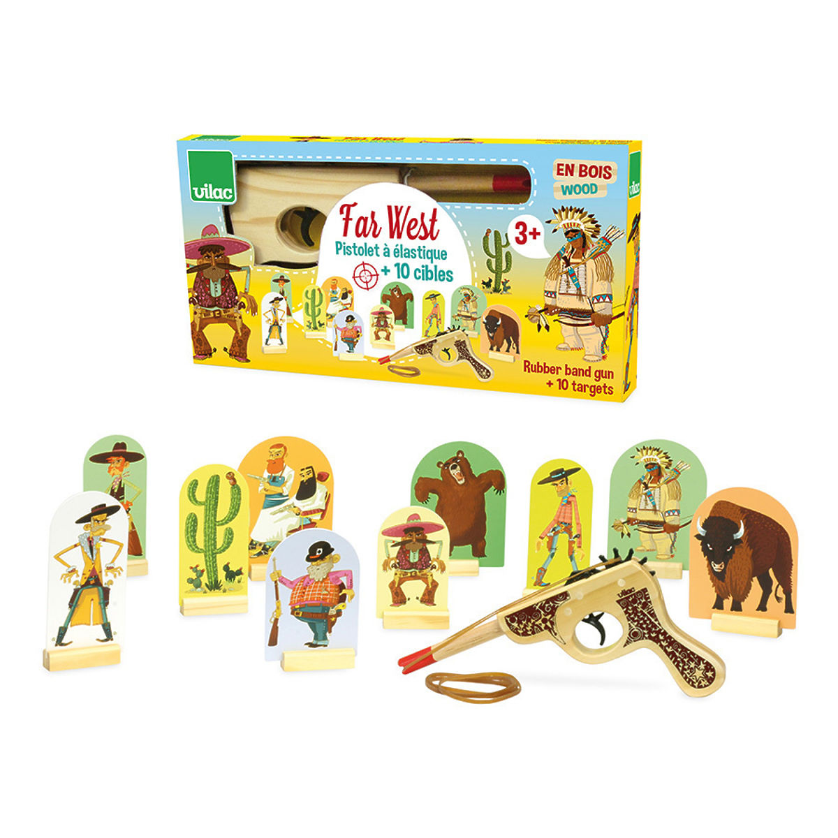 Vadnyugat! Nyugati játék, amelyben az nyer, aki a legtöbb célt lő le. Egyszerűen feszítse ki a gumiszalagot a fából készült fegyverre, állítsa be a célokat, és .. többet