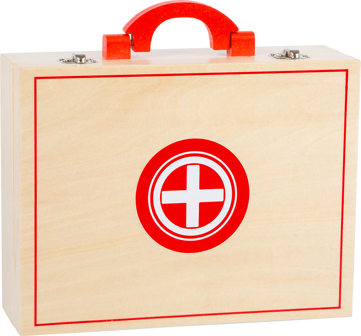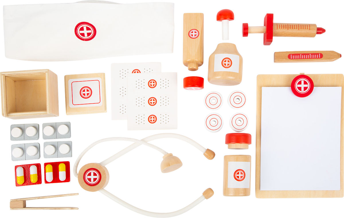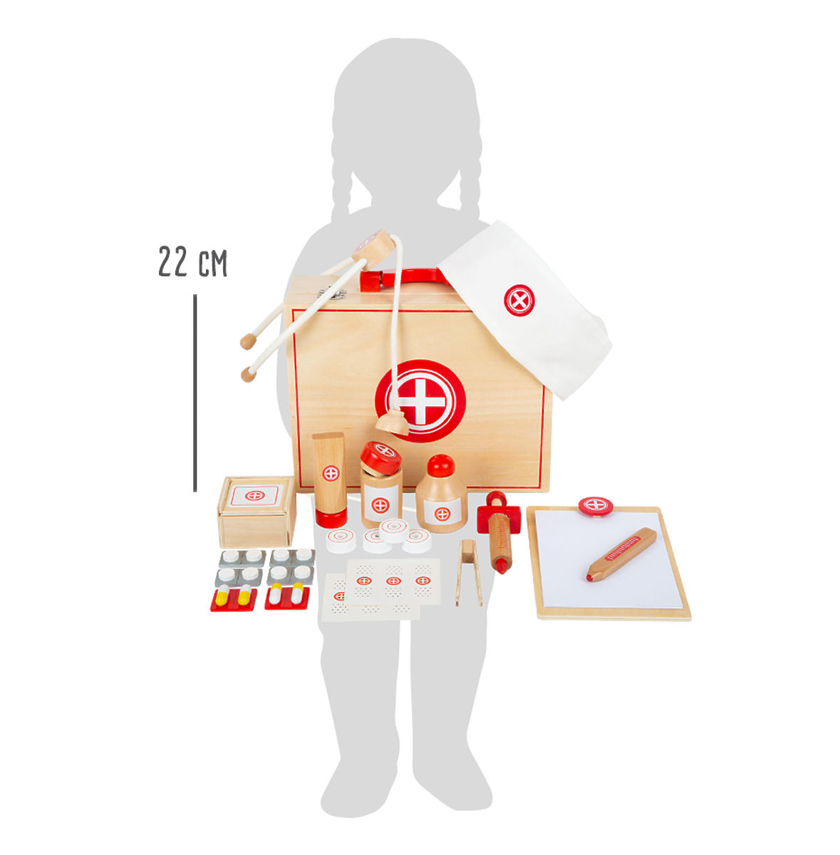 Az orvosok már úton vannak! A fiatal orvosok és orvosnők ezzel a gyermek szettel tökéletesen felszerelhetik magukat a betegekhez vezető útra. A táska tartalmaz minden fontos orvosi eszközt, és jól is néz ki – teljesen fából készült, klasszikus fehér-piros színben. A táskában található kenőcs, tinktúrás üveg, sztetoszkóp, injekciós tű, sebtapaszok, tabletták, csipesz, hőmérő, papírtömb. Természetesen minden csak játékra szolgál, és fából vagy papírból készült. Elsősegély táska plüssállatoknak vagy babáknak. A gyerekek orvososat játszhatnak, ez a játék támogatja a kreativitást és bátorságot ad a gyerekeknek. Minden kiegészítő kényelmesen elfér a táskában. Nyiss saját rendelőt! Főbb jellemzők: Fa táska zárral, Gyógyszeres üvegek, sztetoszkóp, injekciós tű, hőmérő, csipesz, Klasszikus piros-fehér színben