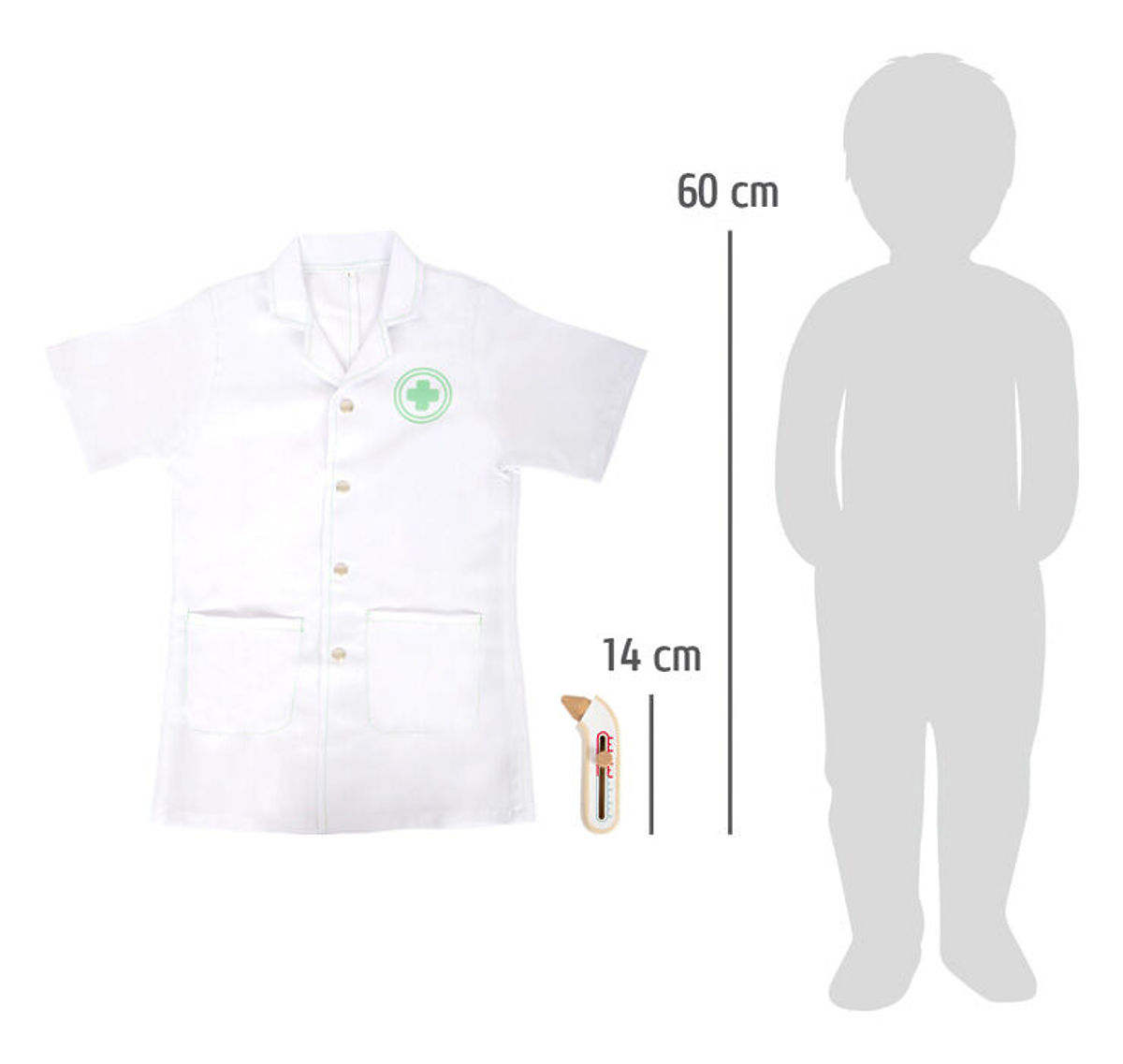 Teljes játékkészlet orvosi köpeny és egészségügyi felszereléssel. Tartalmaz fecskendőt, sztetoszkópot és hőmérőt masszív fából. A fecskendő dugattyúja lenyomás után visszahúzódik. A hőmérő állítható hőmérséklet-jelzővel rendelkezik. Az orvosi köpeny két praktikus zsebbel van ellátva, patentokkal záródik, így a fiatal orvosok gyorsan fel- és levehetik. Szerepjátékhoz vagy farsangi jelmeznek ideális játék. 105-110 cm magas gyerekeknek (méret: 110) alkalmas. Tökéletes kiegészítő orvosi táskához és hasonló termékekhez. Főbb jellemzők: orvosi köpeny és további kiegészítők 105-110 cm magas gyerekeknek tökéletes szerepjátékhoz vagy farsangra.