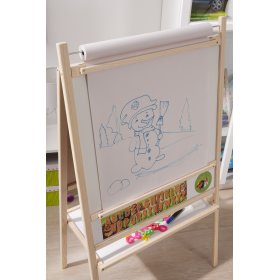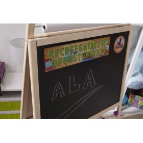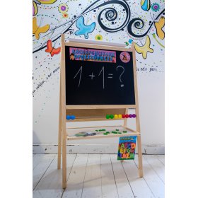A természetes kerettel ellátott tábla bármilyen gyerekszobába alkalmas. Nemcsak tökéletes gyerekjáték, hanem remek eszköz a gyermek tanításához, fejlesztéséhez. A 4 az 1-ben tábla használatával nem csak az írást, a számolást vagy az olvasást, hanem a kreatív gondolkodást is fejlesztheted. Az írófelület alatt egyszerű színes számológépet, kréták és jelölők elhelyezésére szolgáló számlálót találunk.