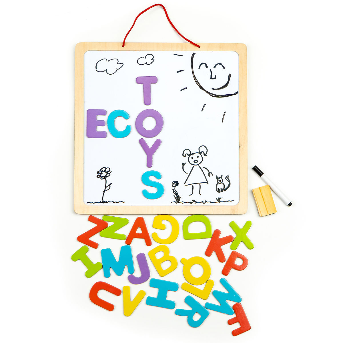 Színes mágneses betűk, törölhető jelölő, kréta és szivacs tartoznak hozzá.