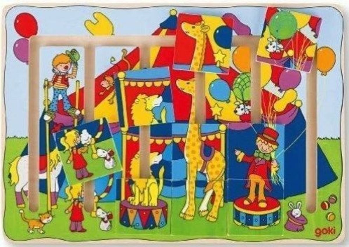A készlet tartalmaz egy táblát egy cirkusz képével és 9 fadarabot.